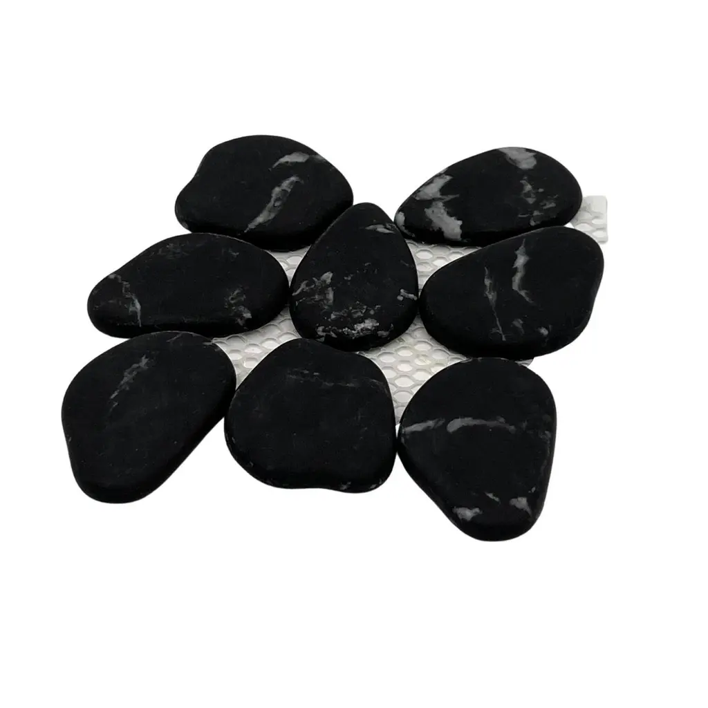 Inspired by The Tile Life Glass Collections, the Recycled Cenote Pebble installations bring you one step closer to the most modern glass kitchen, bathroom, and living room tile decorations. The Tile Life Recycled Cenote Pebble Mosaic Tile features 13" x 13" mesh-mounted sheets of round, matte recycled glass pebbles and rocks, designed for easy installation and trimming. Ideal for backsplashes, bathrooms, showers, floors, and walls, this decorative glass mosaic tile adds natural texture and eco-friendly style to any space. Approved for residential indoor wall installations, it's available in seven colors: Smoke, Blanco, Blend, Charcoal, Crema, Graphite, and Ocean. FEATURES: DIMENSIONS: