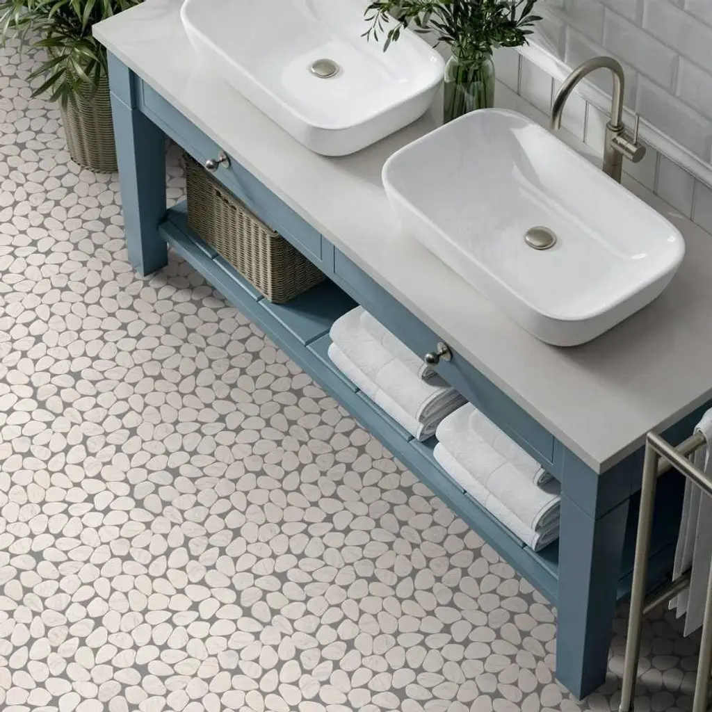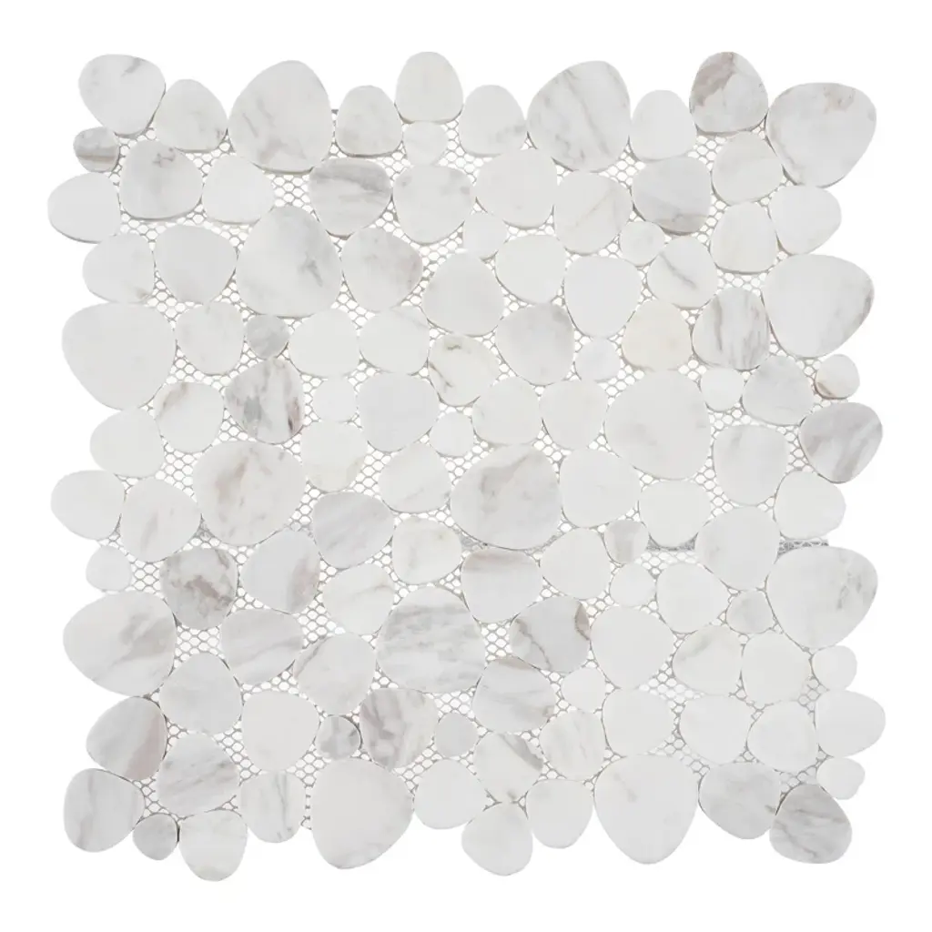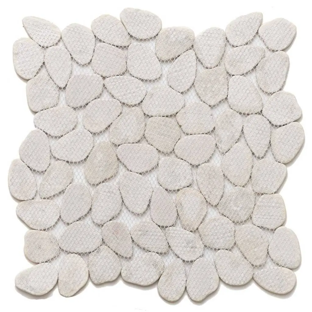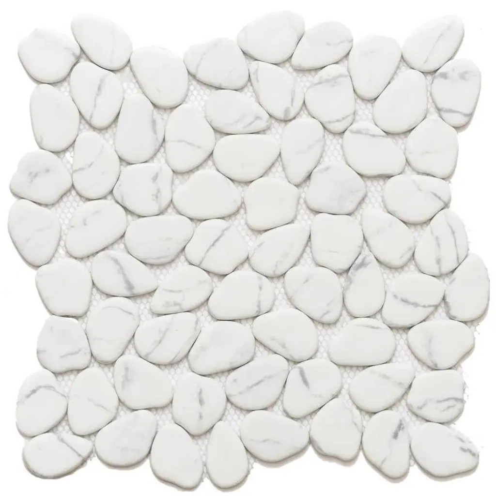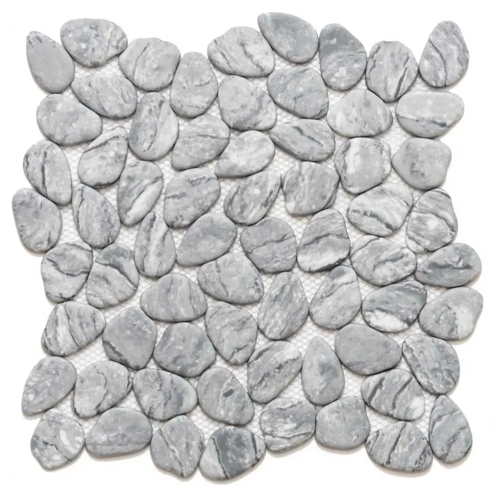 Inspired by The Tile Life Glass Collections, the Recycled Cenote Pebble installations bring you one step closer to the most modern glass kitchen, bathroom, and living room tile decorations. FEATURES: Glass tile for flooring and wall applications Glass pebbles and rocks mosaic tile Mesh backed Impervious and waterproof V3 Moderate variation PEI 2 Matte glass Easy to install 13" x 13" pebbles/ rocks glass tiles Ideal for backsplash, bathroom, shower, floor, wall Recycled Cenote Pebble is offered in Smoke, Blanco, Blend, Charcoal, Crema, Graphite, and Ocean DIMENSIONS: Mosaic sheet: 12.75-inch x 12.75-inch Overall product weight: 57.75 lb. Surface area per carton: 14 square feet