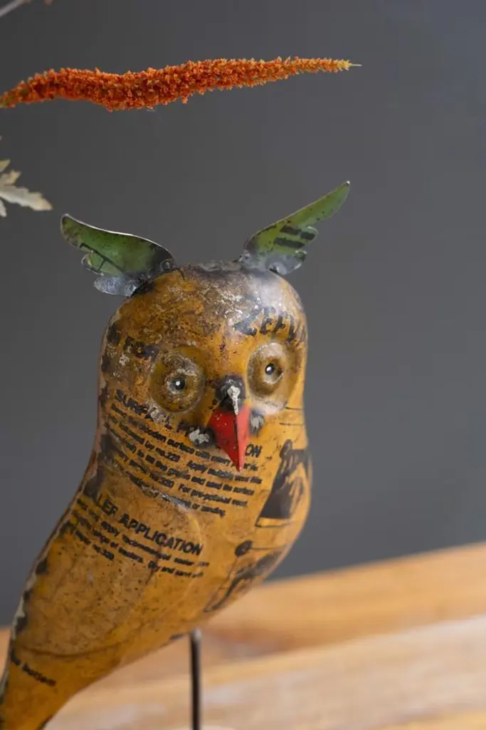 Recycled Metal Owl on Wood Base. Bring a touch of rustic whimsy to your space with the Recycled Metal Owl on Wood Base. Handcrafted from repurposed metal, this charming owl features layered textures and playful detailing, all perched on a sturdy wooden base. It’s a unique, eco-friendly accent that adds personality and warmth to shelves, mantels, or tabletops. Matching pieces sold separately. Fully assembled. Manufacturer: Kalalou.