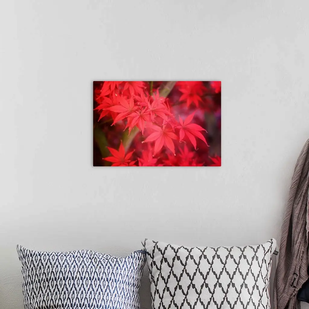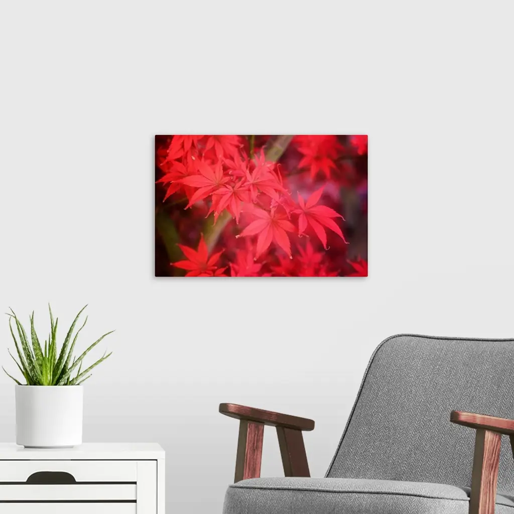 Close up of bright red fall maple leaves.