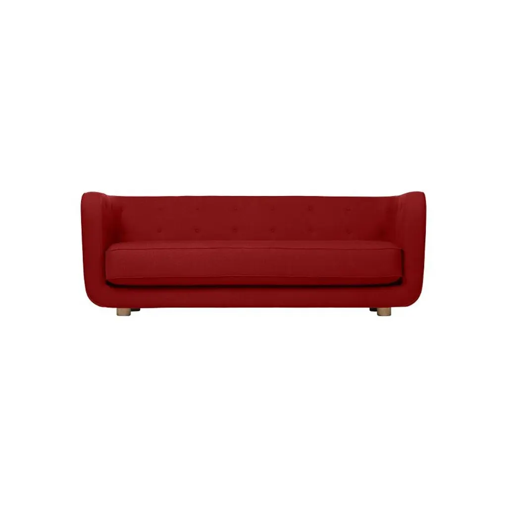 Red and smoked Oak Raf Simons Vidar 3 Vilhelm sofa by LassenDimensions: W 217 x D 88 x H 80 cm Materials: Textile, Oak.Vilhelm is a beautiful padded 3-seater sofa designed by Flemming Lassen in 1935. A sofa must be able to function in several ways. It should invite calm and contemplation. Create a private space you can hide in and at the same time invite to life and play. It must be able to withstand sitting on the backrest or on the armrests and then it must be able to stand in the middle of the room if you want to.In addition to being aesthetically beautiful and harmonious, the design makes absolute sense in relation to these parameters.By Lassen is a Danish design brand focused on iconic designs created by Mogens and Flemming Lassen, founded by Lassens’ relatives in 2008. Brothers Mogens (1901-1987) and Flemming (1902-1984) Lassen are known as two of Denmark’s greatest architects and designers. Both were renowned pioneers of Danish functionalism and modernist architecture, honoured with numerous prestigious medals and awards. Headed by Mogens Lassen’s grandson Søren Lassen, By Lassen carries on the brothers’ design philosophy by manufacturing their iconic designs as well as products by other designers that complement the Lassen’s functionalist style. The company’s mission is to continue the tradition of timelessness, functionality and quality, and to introduce the Lassen’s design heritage to new generations.
