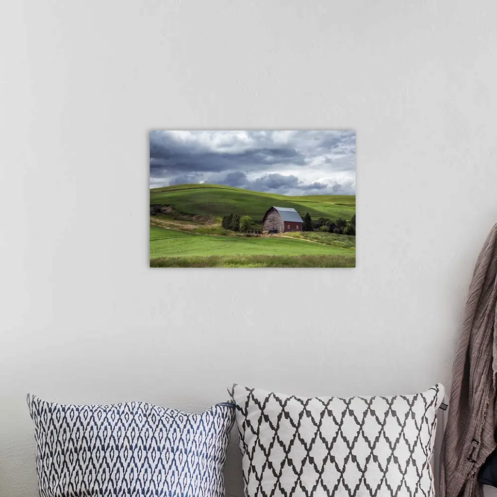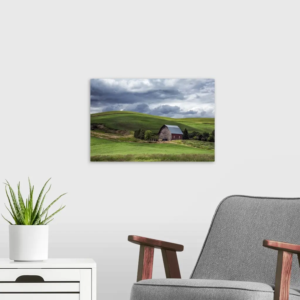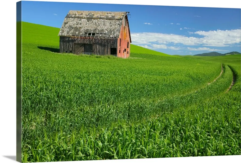 Red Barn And Green Wheat Fields In The Palouse, Washington