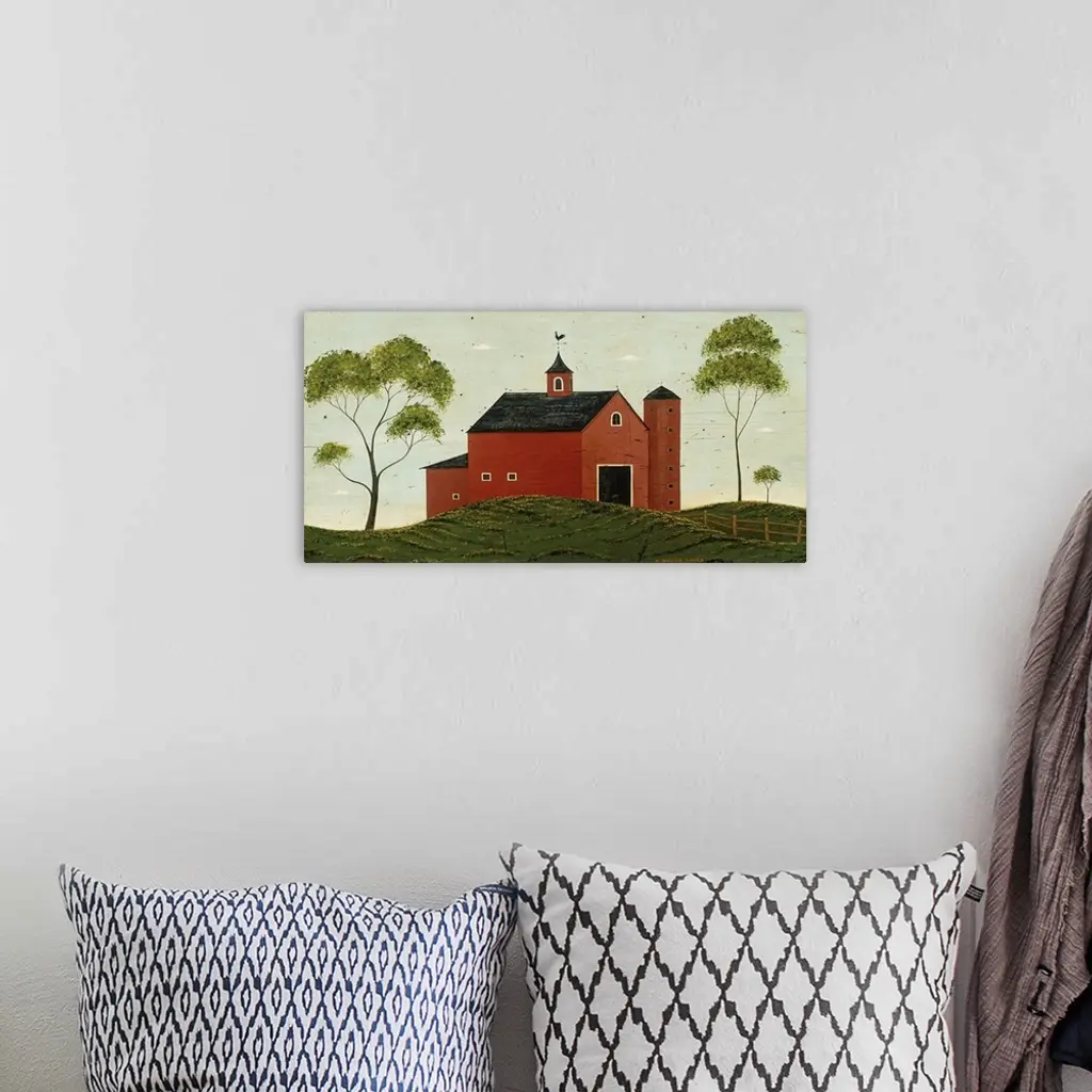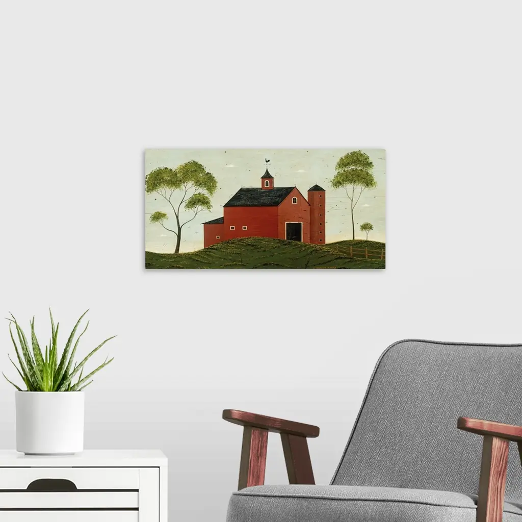 Folk art featuring a farm building and three trees with a wooden fence on a rolling hill with clear skies.