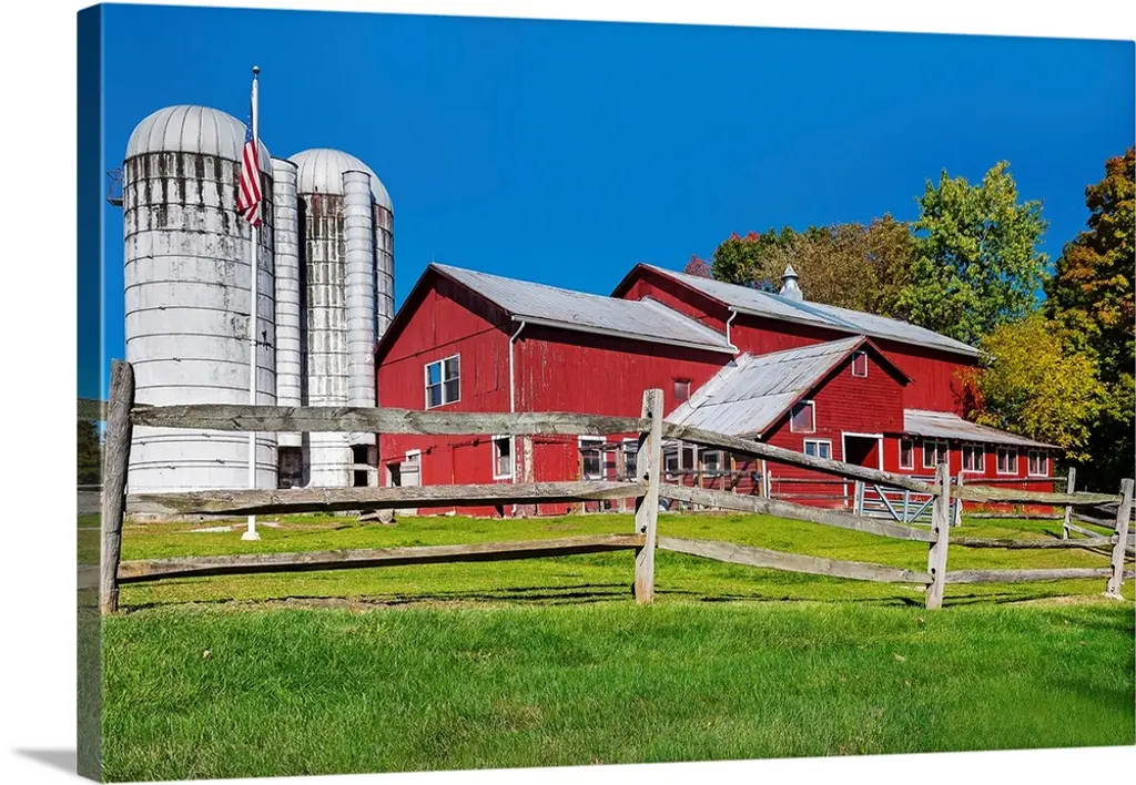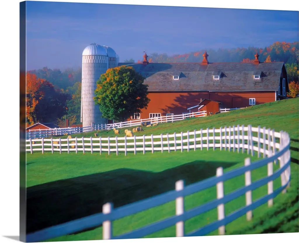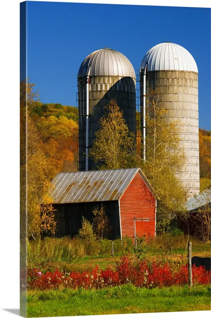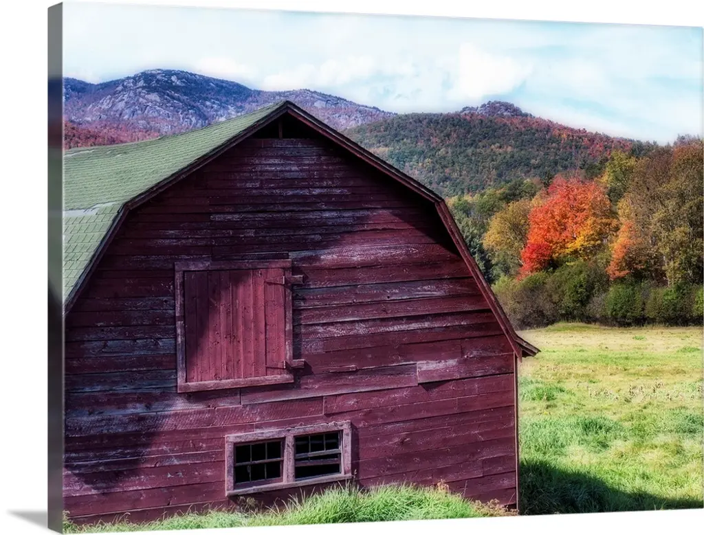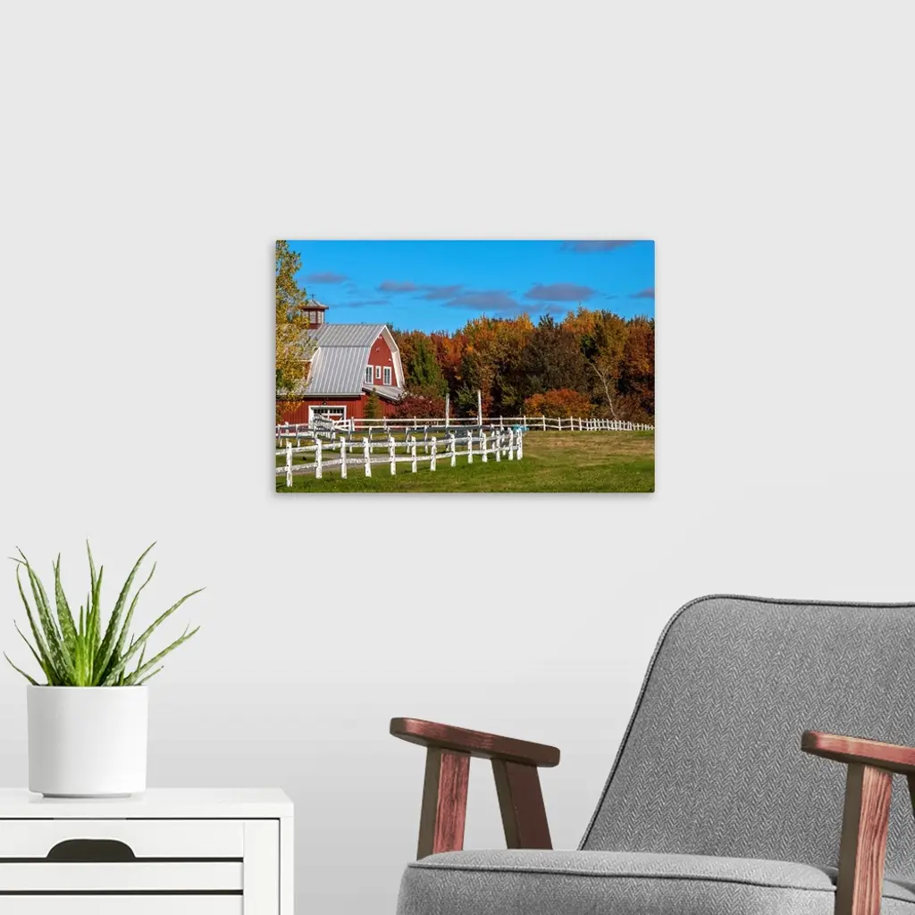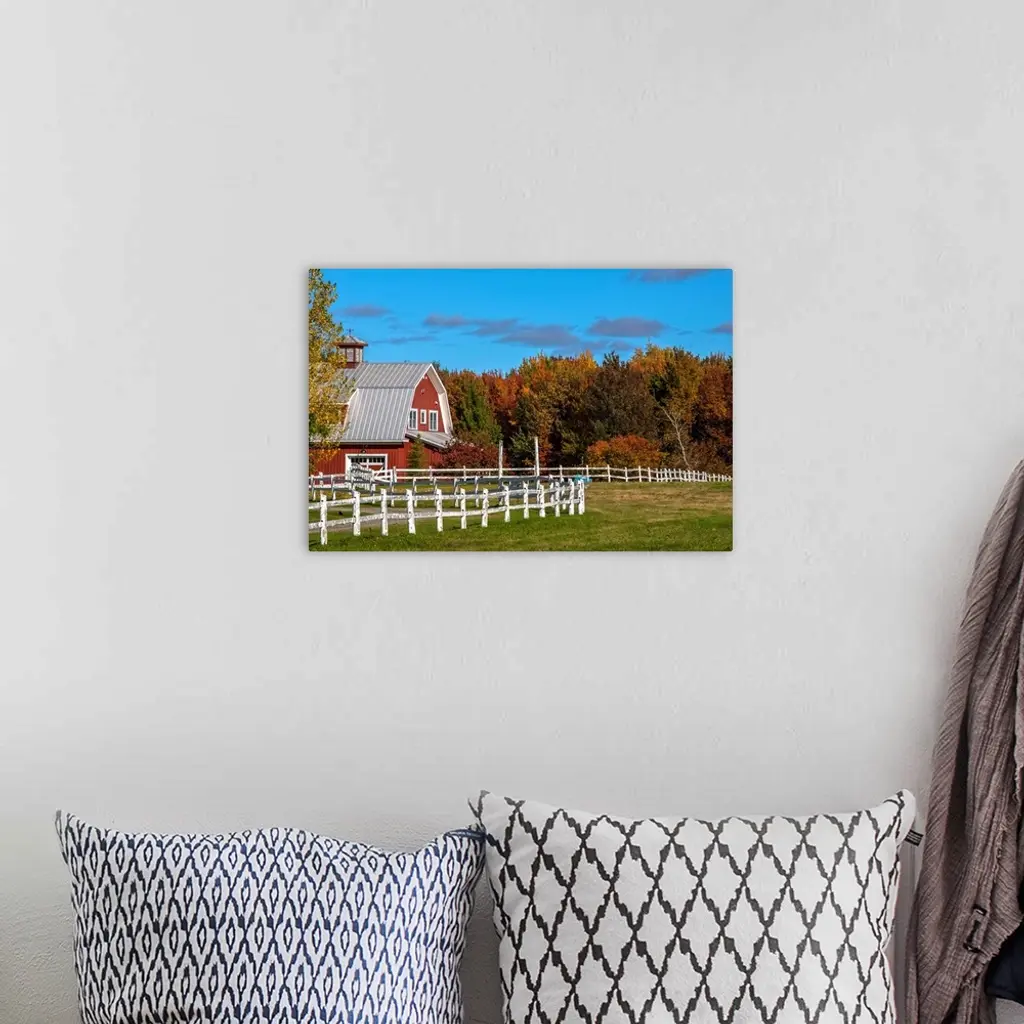 Red barn with trees in autumn colours, Sutton, Quebec, Canada.