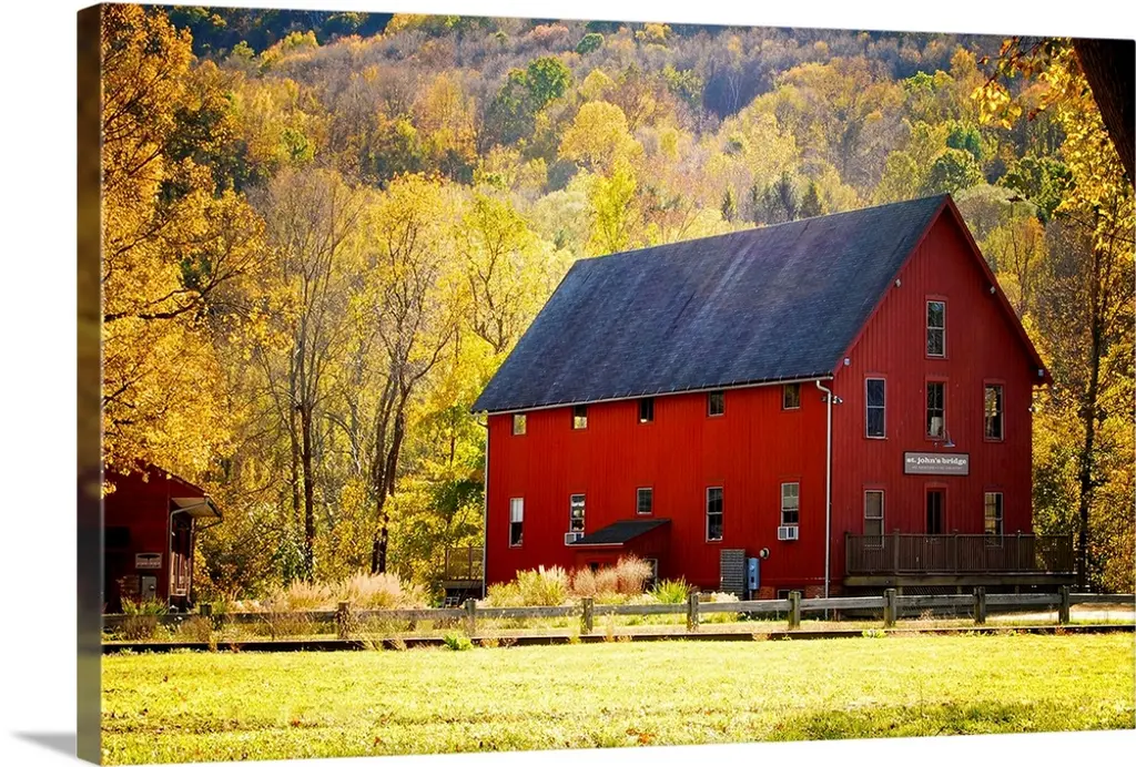 Red Barn With Trees In Autumn Colours, Sutton, Quebec, Canada