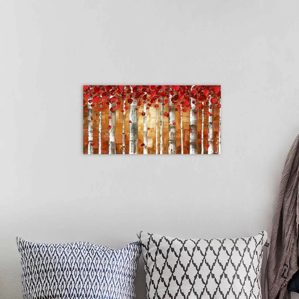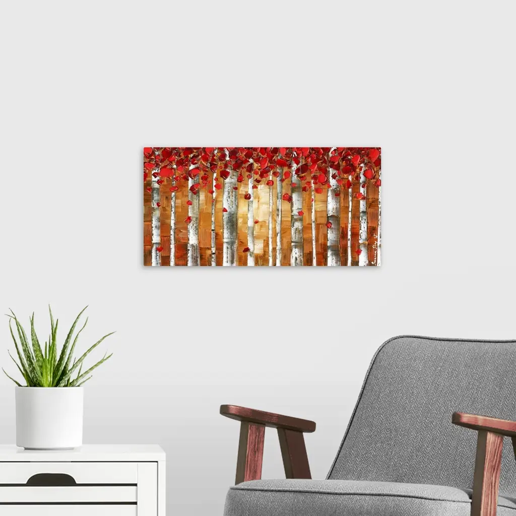 Autumn colors, red foliage birch trees over an abstract background in hues of warm brown and rust