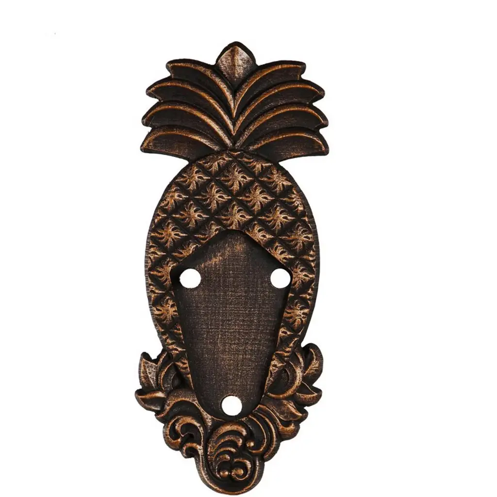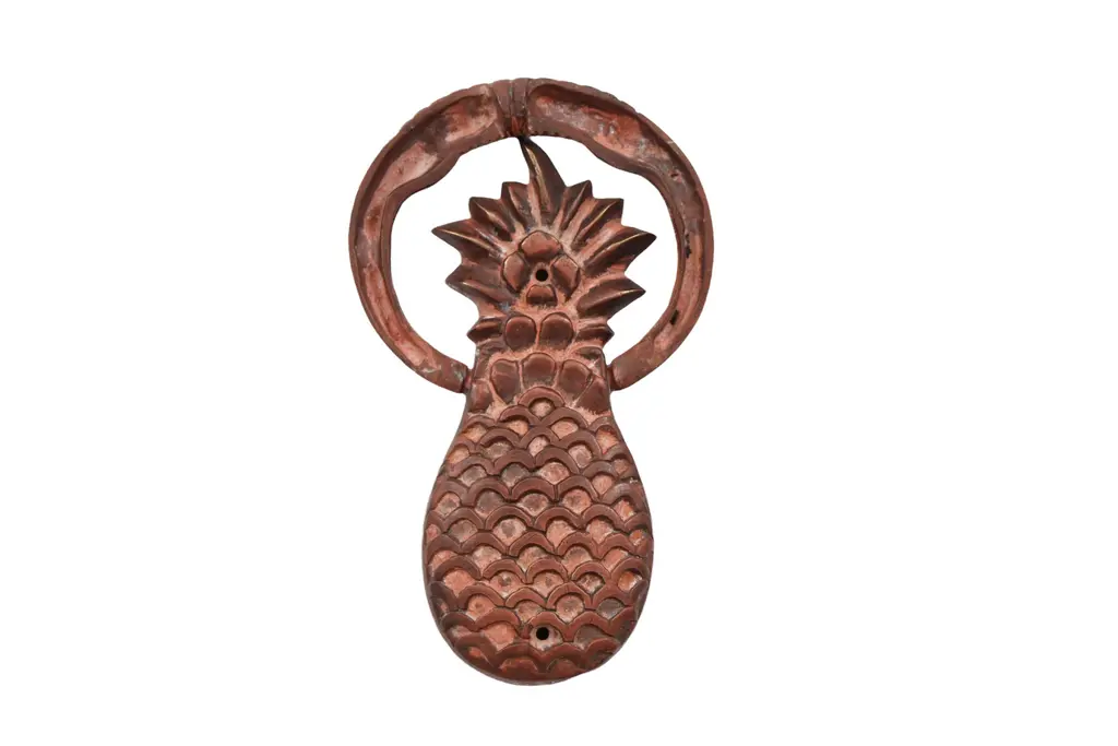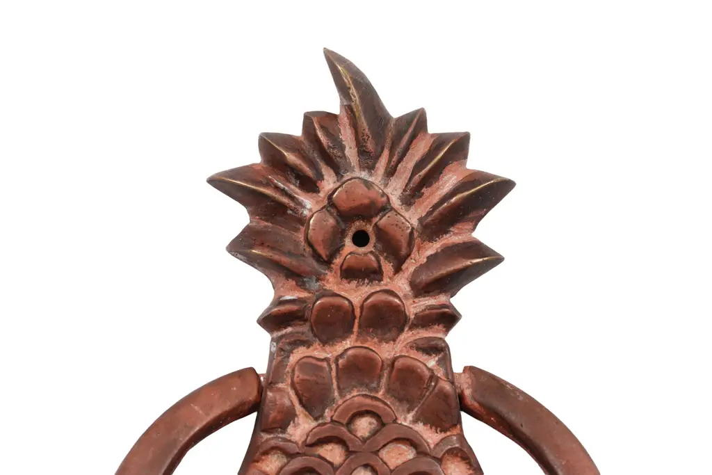 A red brass door knocker shaped like a pineapple. Cast with a prominent crown and covered with decorative scallop shaped fruitlets. A brass ring decorated with lines is positioned to meet the base of the pineapple.
