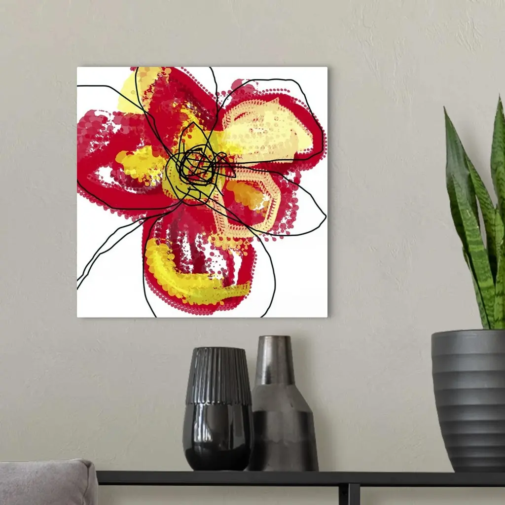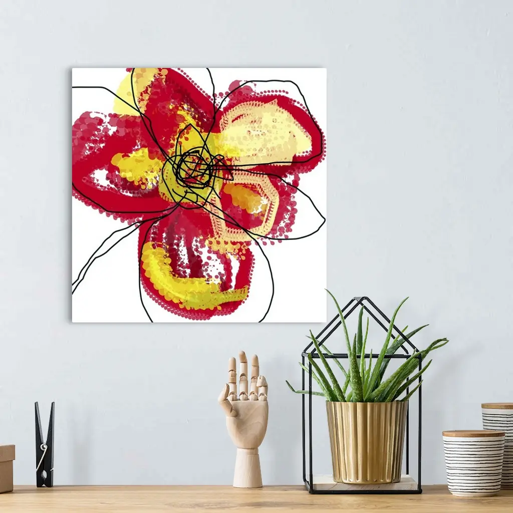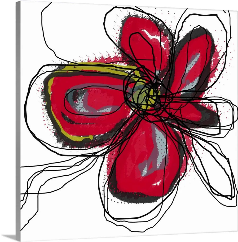 Contemporary pop art. A flower made of repeating circles and smudges is overlain with a shifted black outline, with areas of color bleeding outside of the lines.