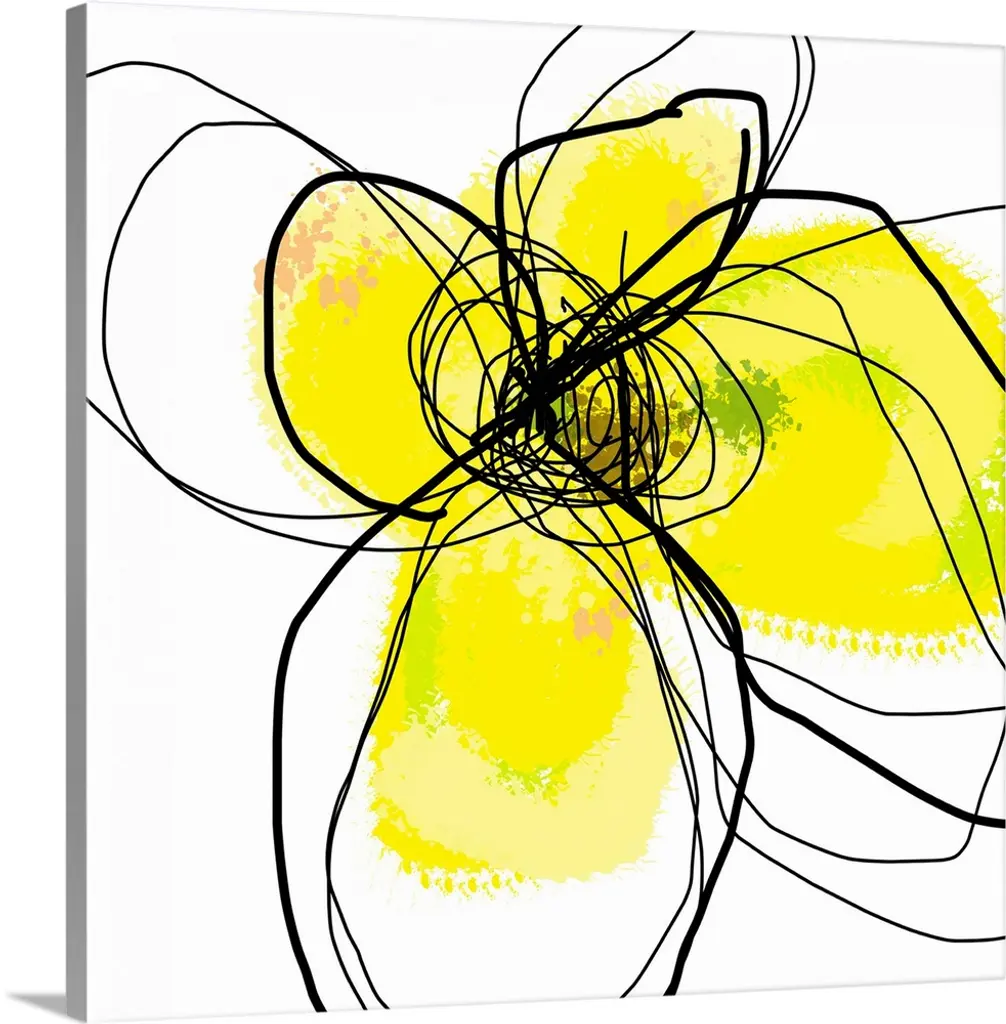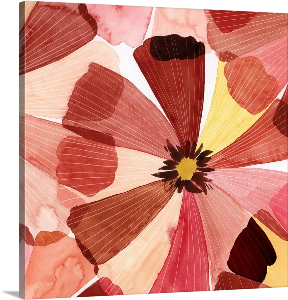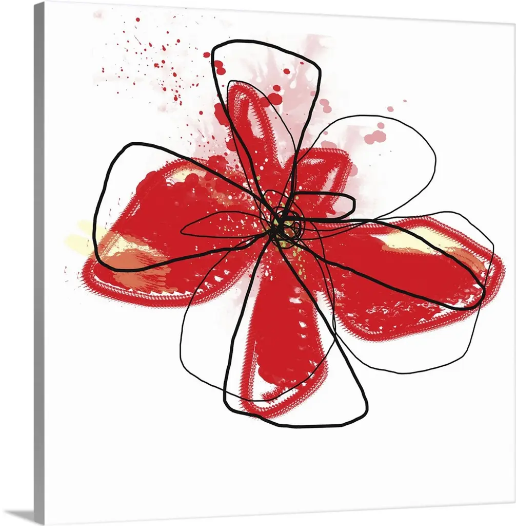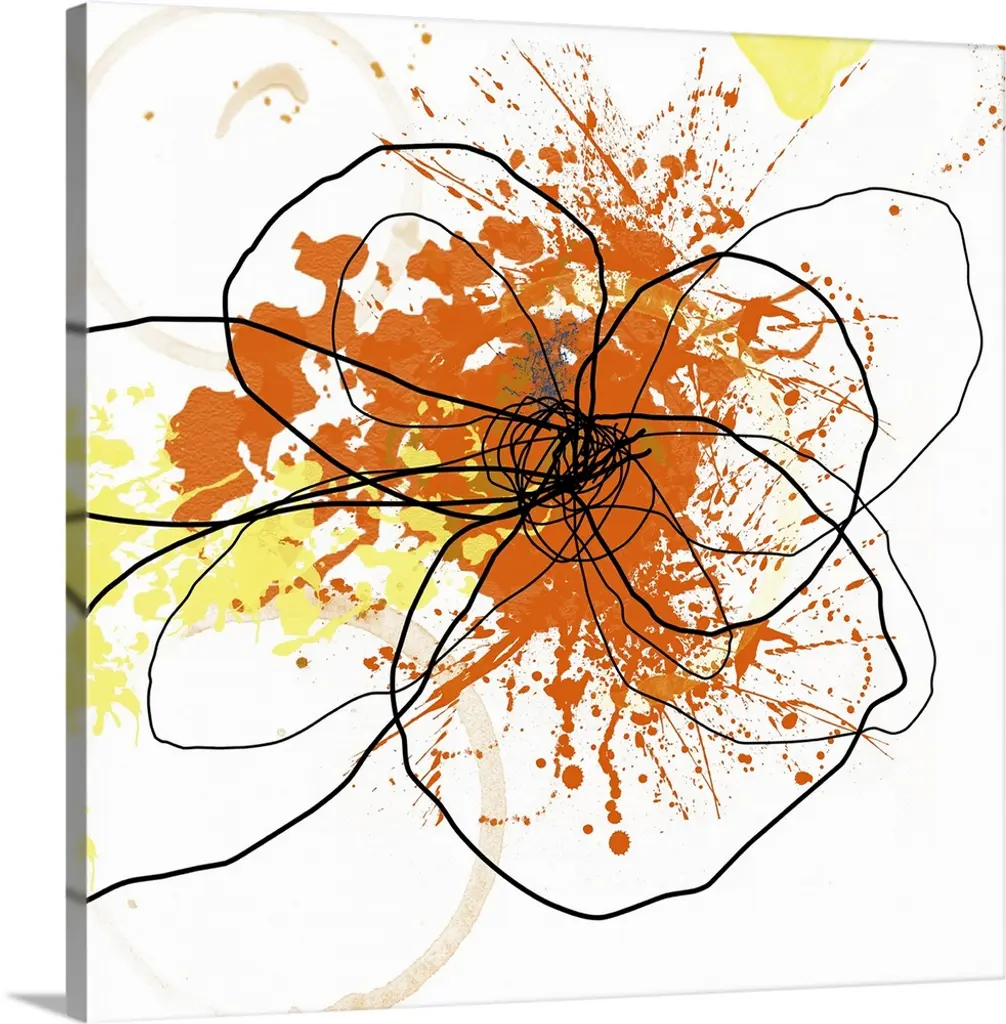 Contemporary pop art. A flower made of repeating circles and smudges is overlain with a shifted black outline, with areas of color bleeding outside of the lines.