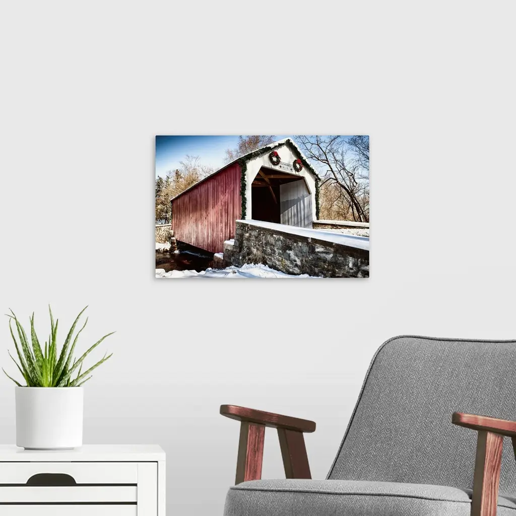 Fine art photo of a covered bridge under a light snowfall.
