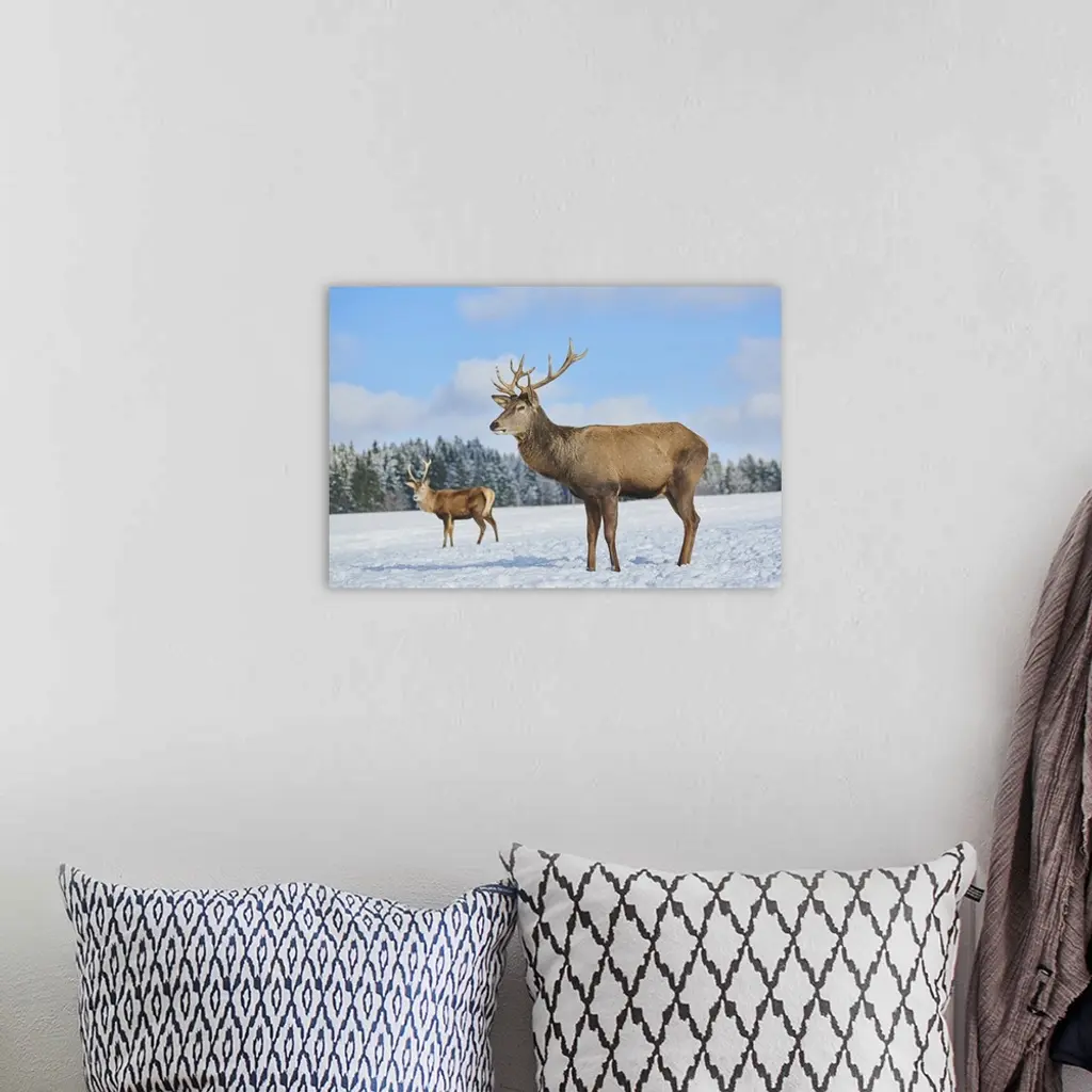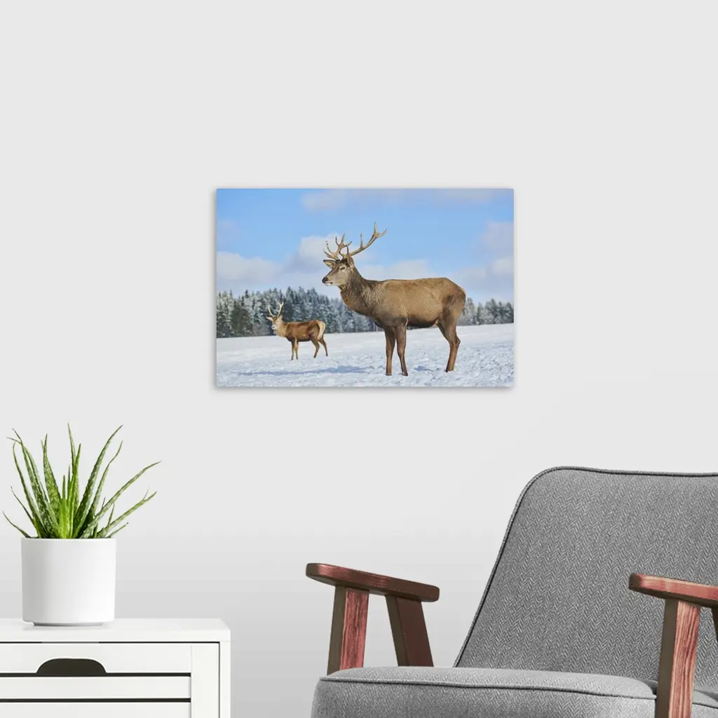 Red deer (Cervus elaphus) on a snowy meadow, Bavaria, Germany