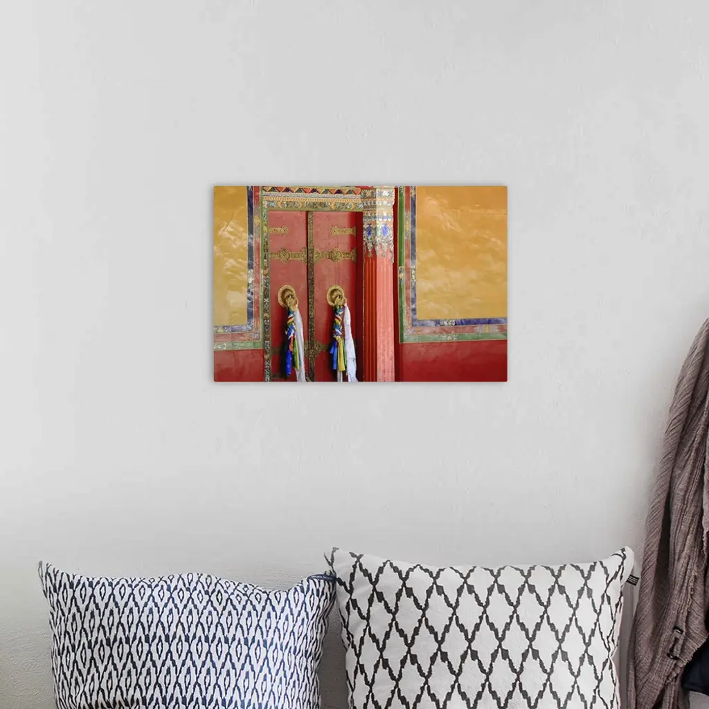 Red double door with black and gold decoration batten, a colorist doorframe, gilded doorknobs and Tibetan colored fabrics hanging against a red and pumpkin color painted wall. Drepung-rice heap monastery of Gelugpa-Yellow hat order. Foot of Mt. Ghephel-Lhasa pref. Tibet.