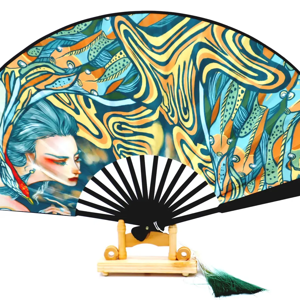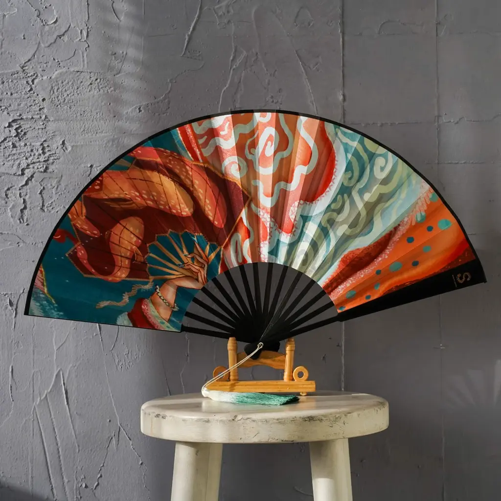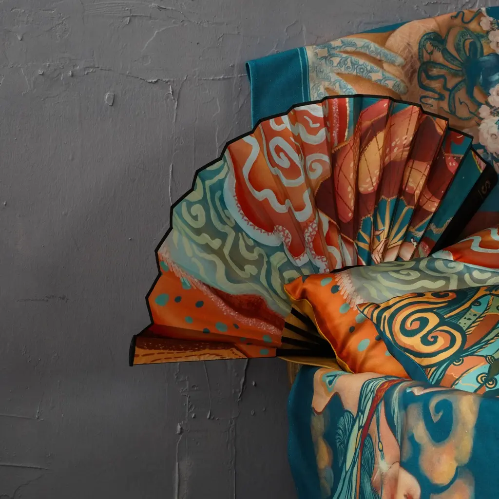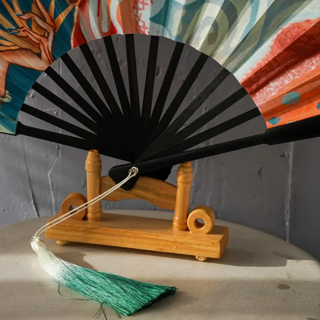 Make a bold statement with the ‘Red Fanfare’ Holding Fan, a striking blend of elegance and craftsmanship. Crafted from silk satin and fine wood, its intricate engraving and rich hues exude timeless sophistication. Lightweight and foldable, it serves as both a functional accessory and an exquisite decorative piece. Complete with a removable teal tassel and a bamboo stand, this fan is a perfect addition to your collection or a thoughtful gift for lovers of refined artistry.