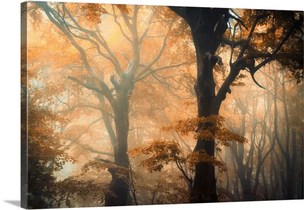 Forest mood with red trees in the fog crossing by a central path, Broceliande forest in Brittany, France.