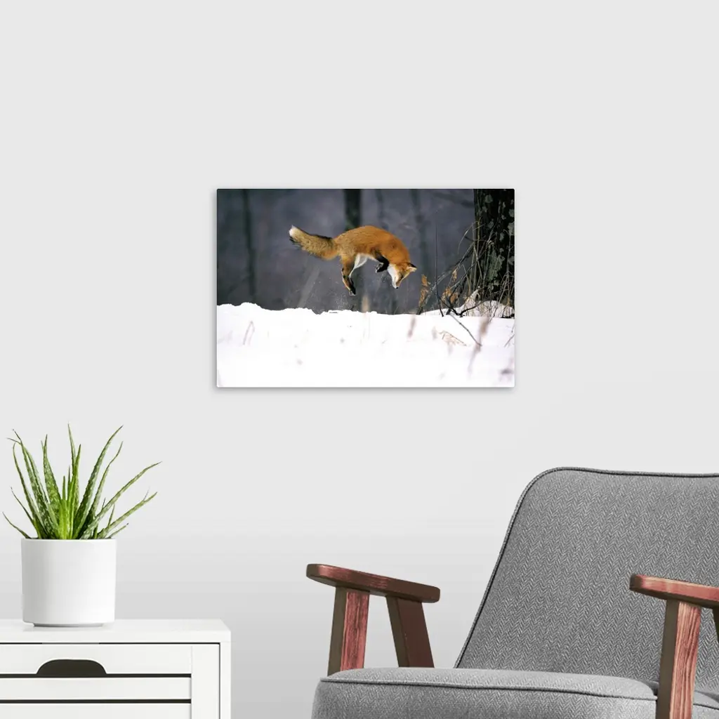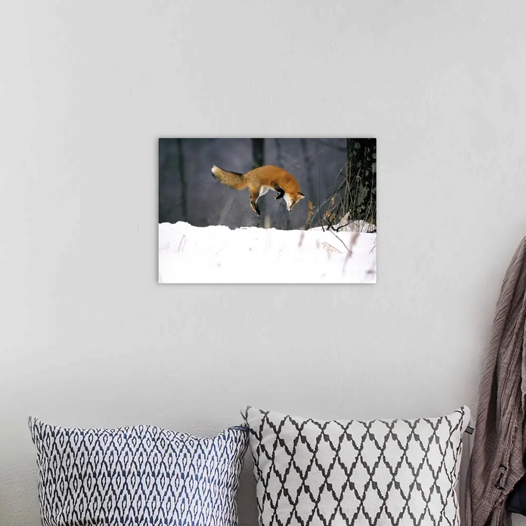 Red Fox Jumping In The Snow wall art for home and office decor. Discover canvas art prints, photos, mural, big canvas art and framed wall art in GreatBigCanvas.com's varied collections.