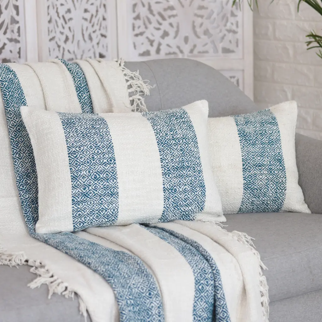 Red dotted cotton blend fabric matches with white viscose pieces stitched piece by piece to get the geometric form. Rectangular and circular form cushions add joy to your living room. The cushions come with its inner cushion pad