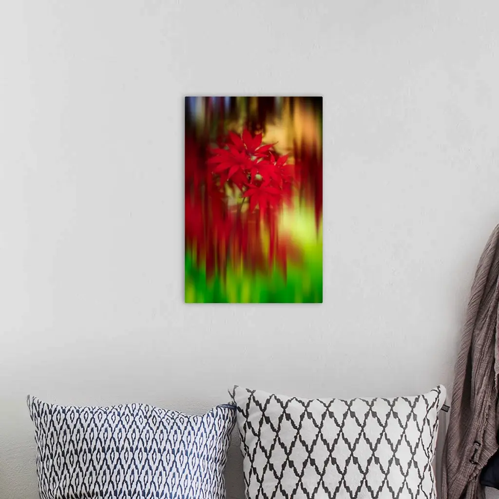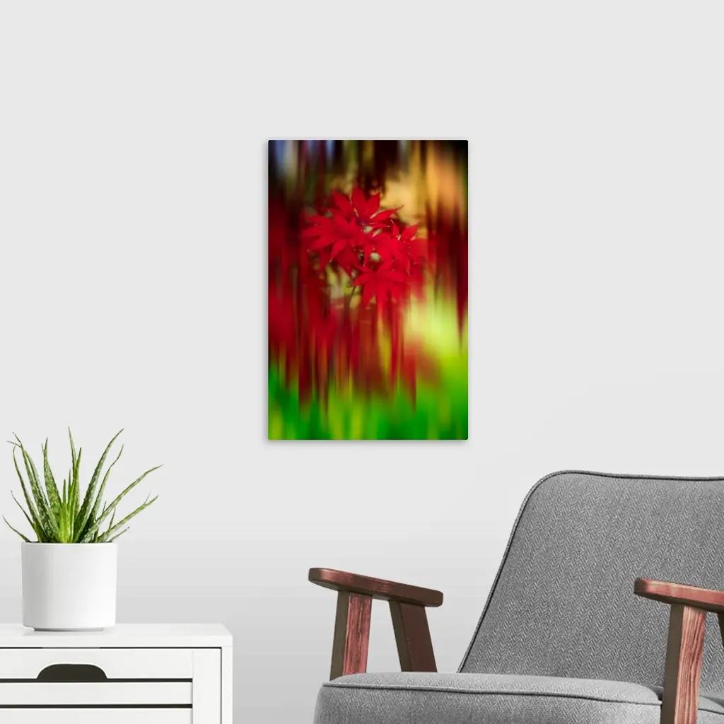 Fine art photograph of bright red Japanese maple leaves in focus with streaked blurring all around them.