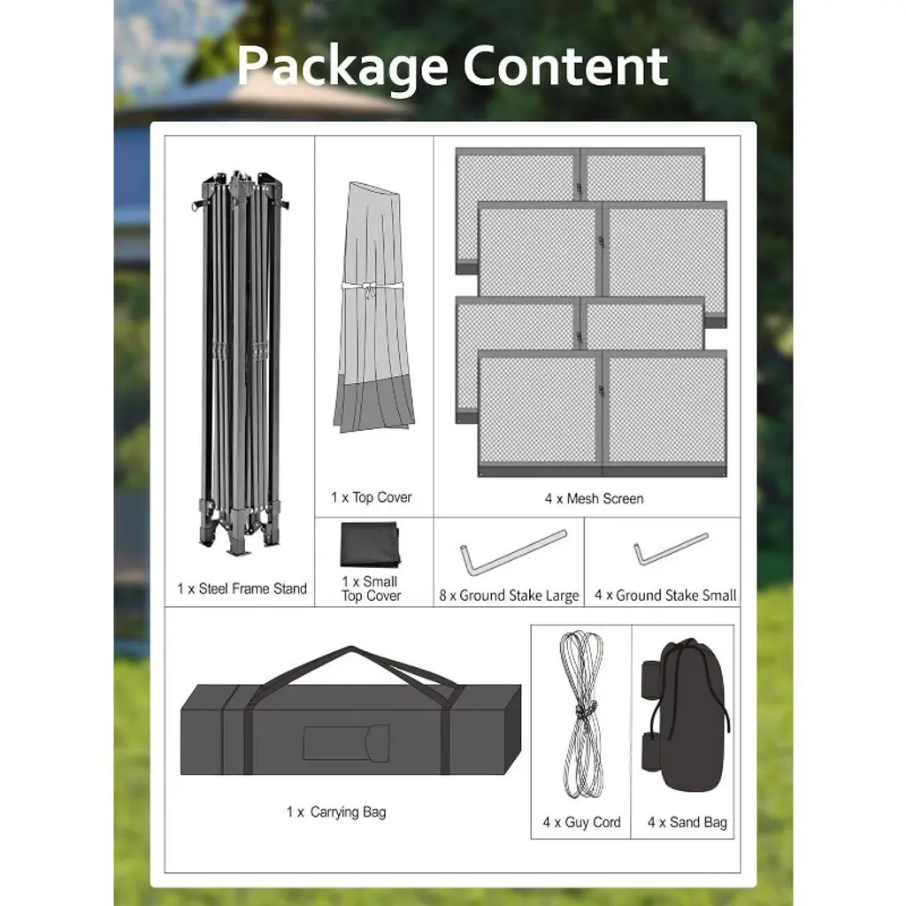 Stable Construction: Our - is engineered for strength with a high-quality,thickened steel frame and rust-resistant coating,ensuring longevity and stability.This Outdoor Canopy Tent with Mosquito Netting is built to last,making it a reliable choice for your backyard tent needs.Material: Enjoy silver plated PU lining with UPF 50+ UV protection in our Outdoor patio gazebo,keeping you safe from the sun's harmful rays.The waterproof and sun-proof material, along with high-quality mosquito nets, provide excellent protection while maintaining visibility and airflow.Spacious Space: Offering 169 square feet of shaded space,our - is perfect for social gatherings.The 13x13FT canopy comfortably accommodates 10 people, providing ample headroom and making it an ideal space for family and friends to relax underVersatile Mosquito Net Walls: This backyard tent comes with four zippered mosquito net walls that can be easily installed or removed.Ideal for various outdoor spaces, from patios to poolside parties it keeps bugs at bay while you enjoy the outdoorsEasy to Install :Our - is designed for easy installation, Simply unfold the frame, attach the canopy cover,secure the corners, and extend the legs.With just 1-2 people,you can quickly build your outdoor tent, making it a convenient option for any outdoor event.