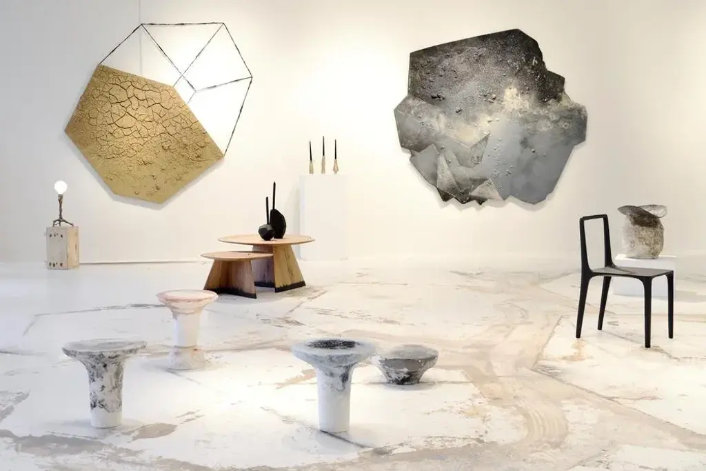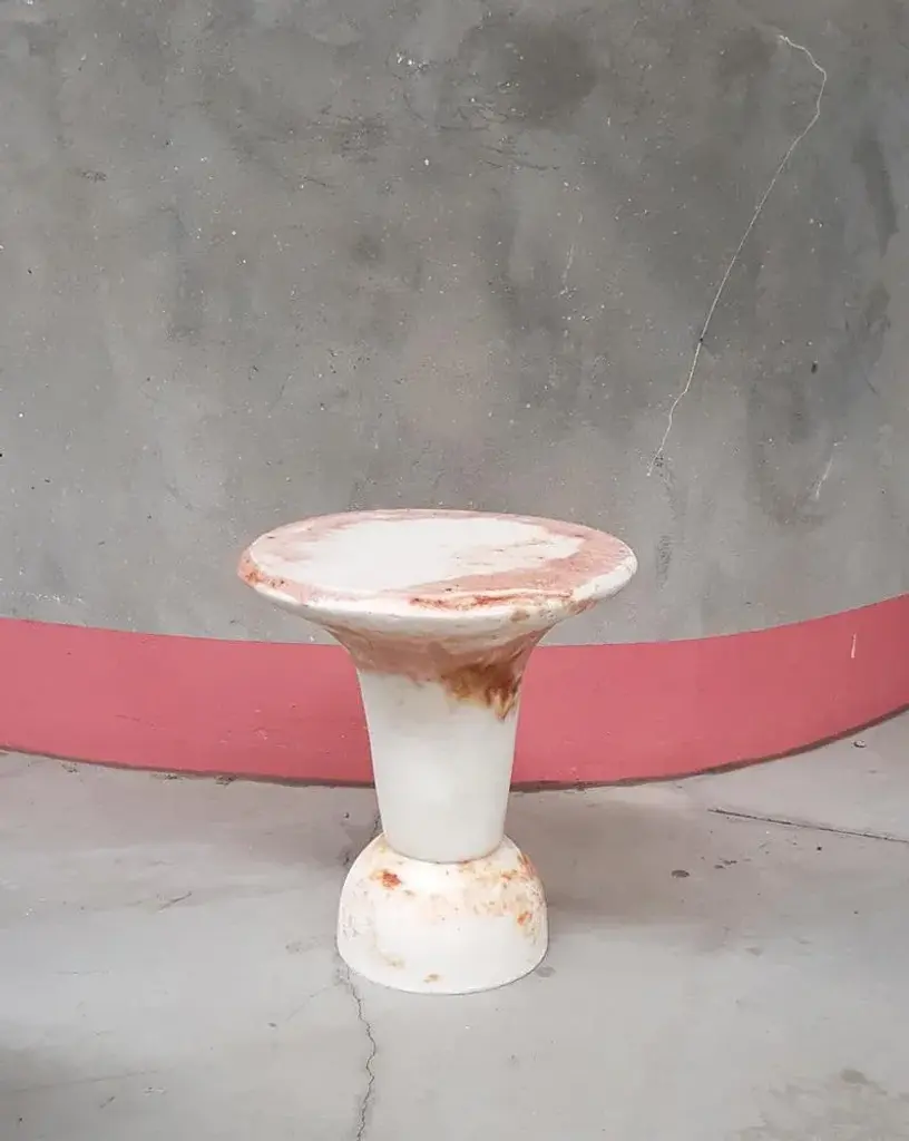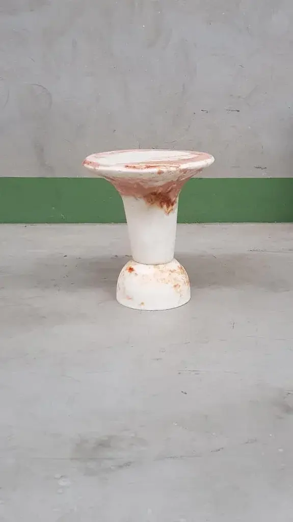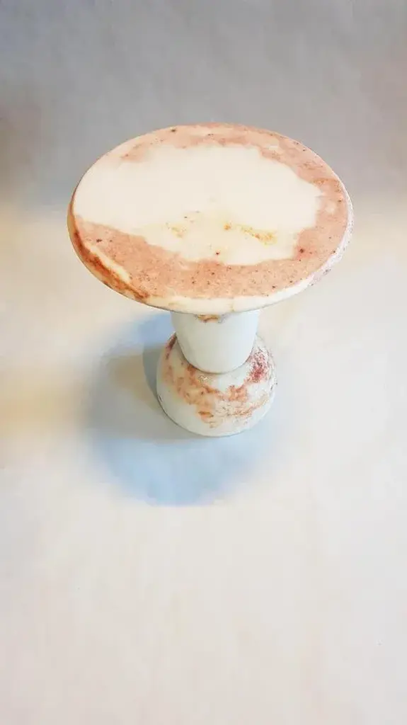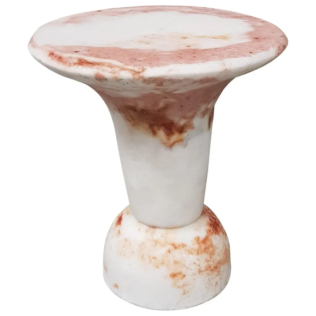 Unique red marbled salts guéridon, roxane lahidji material: marbled salts, a unique award winning technique developed by roxane lahidji dimensions: 55 x 35 x 35 cm unique guéridon award winner of bolia design awards 2019 and fd100 and present in the collections of the design museum gent. Lahidji's marbled salts creations in the press: elle decoration nl: ddw17- jan/feb 2018 object rotterdam - feb/march 2018 destandaard magazine - june 2018 elle decoration uk- sept. 2018 boek boq - architecture - oct. 2018 why material matters - oct. 2018 roxane lahidji roxane lahidji is an alchemist as much as a designer. She seeks a reconnection to fundamental materials in objects of our daily lives by developing her own transforming and moulding methods. In terms of design, her intuitive methodology associates concepts with material symbolics and consumption or usage habits, which defines a dwelling function and a final shaping. Fascinated by precious surfaces and their story telling, she works in a constant research for meaning in patterns, textures and shades; focusing on liquid and powdered substances she melts, mixes, fusions into solid objects. With the deep concern of reconciliating production and sustainability, her design focuses on disregarded or cheap materials brought to a new life, while twisting low tech methods and traditional crafts techniques. Roxane lahidji was born in paris in 1992 and grew up in the french capitale before studying illustration and product design in strasbourg (hear). After her bachelor (with distinction), she pursued her research for new design values in design academy eindhoven and graduated from the social design master department in june 2017. This piece is attributed to the mentioned designer/maker. It has no attribution mark and no official proof of authenticity, however it is well documented in design history. I take full responsibility for any authenticity issues arising from misattribution
