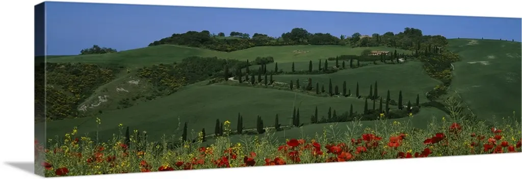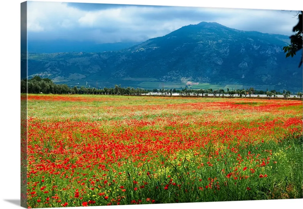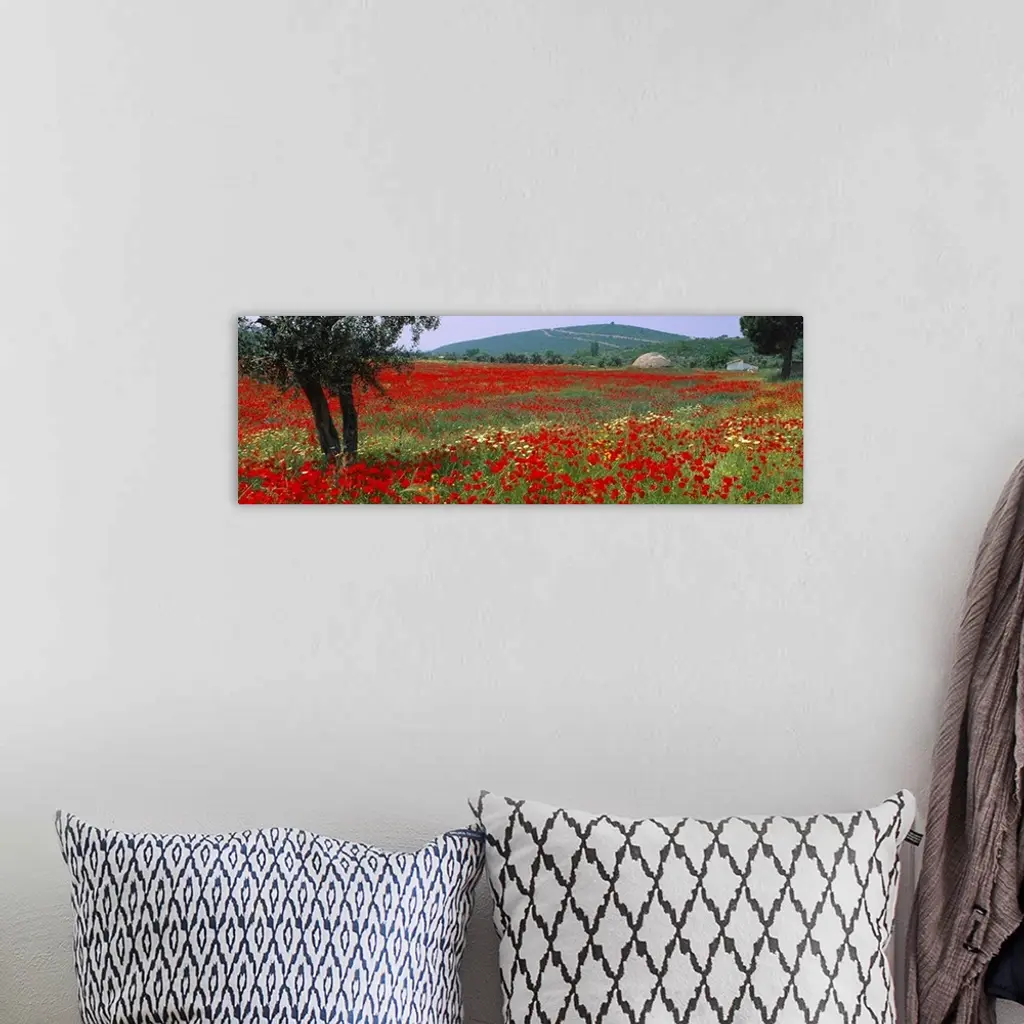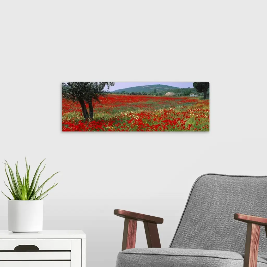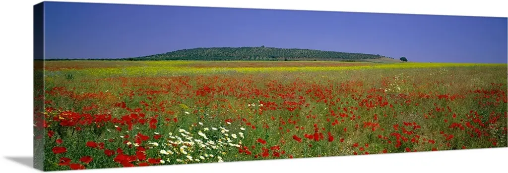A field amongst hills in an arid climate wildflowers bloom in the grass on this panoramic wall art for the home or office.