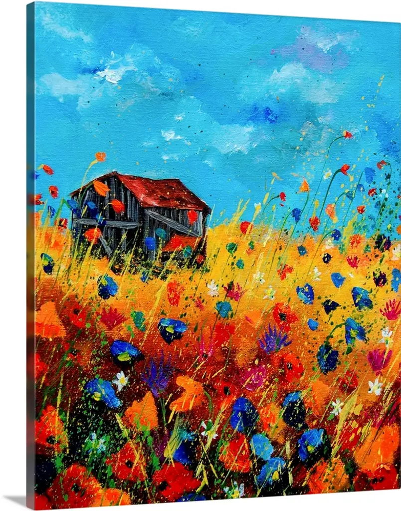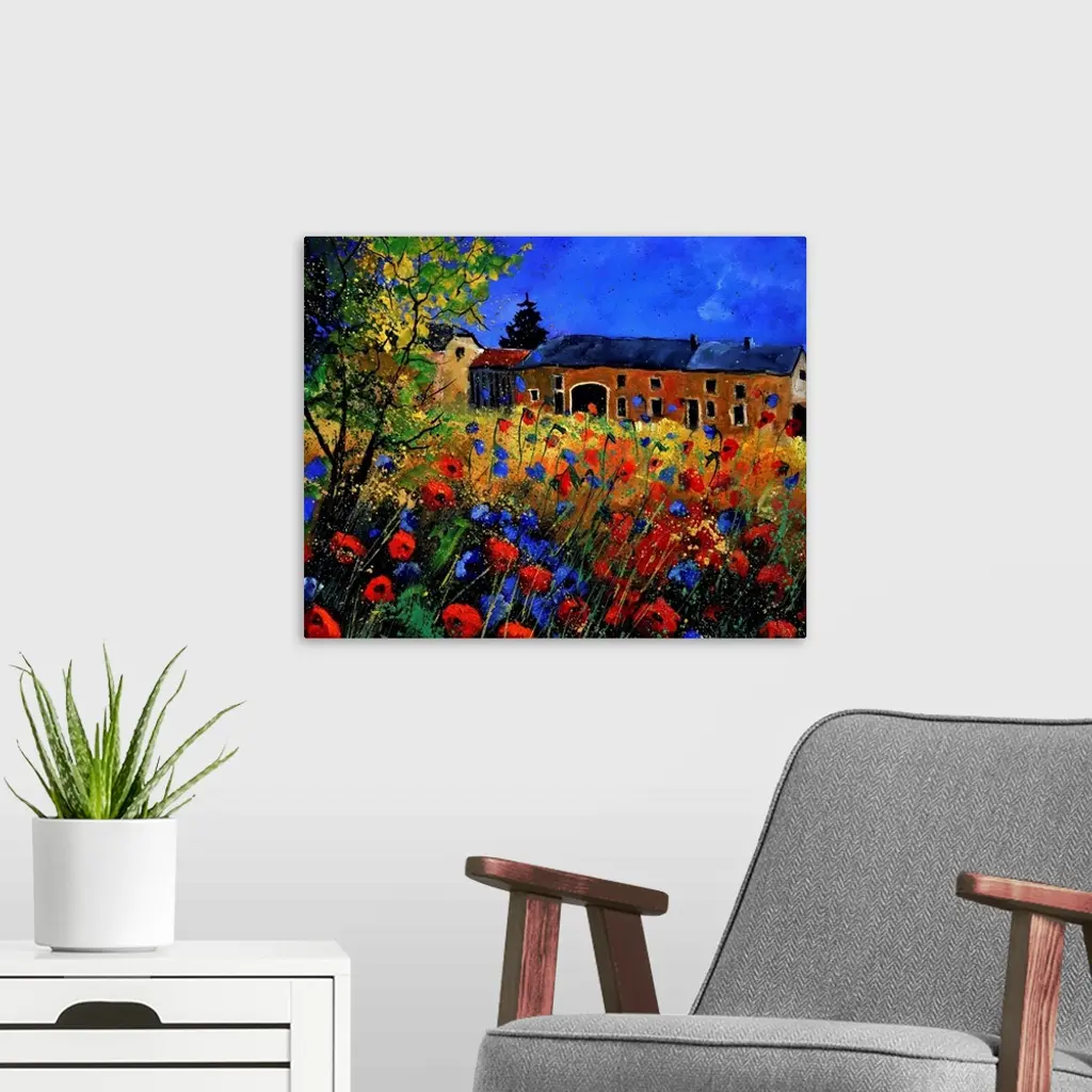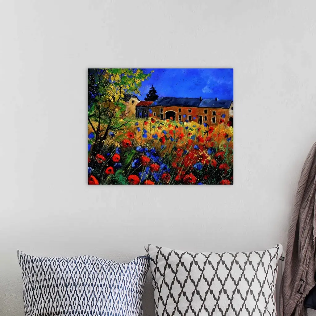 Vibrant colored springtime scene of a house surround by blooming flowers and trees with a bright blue sky.