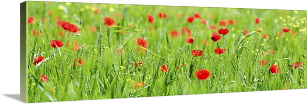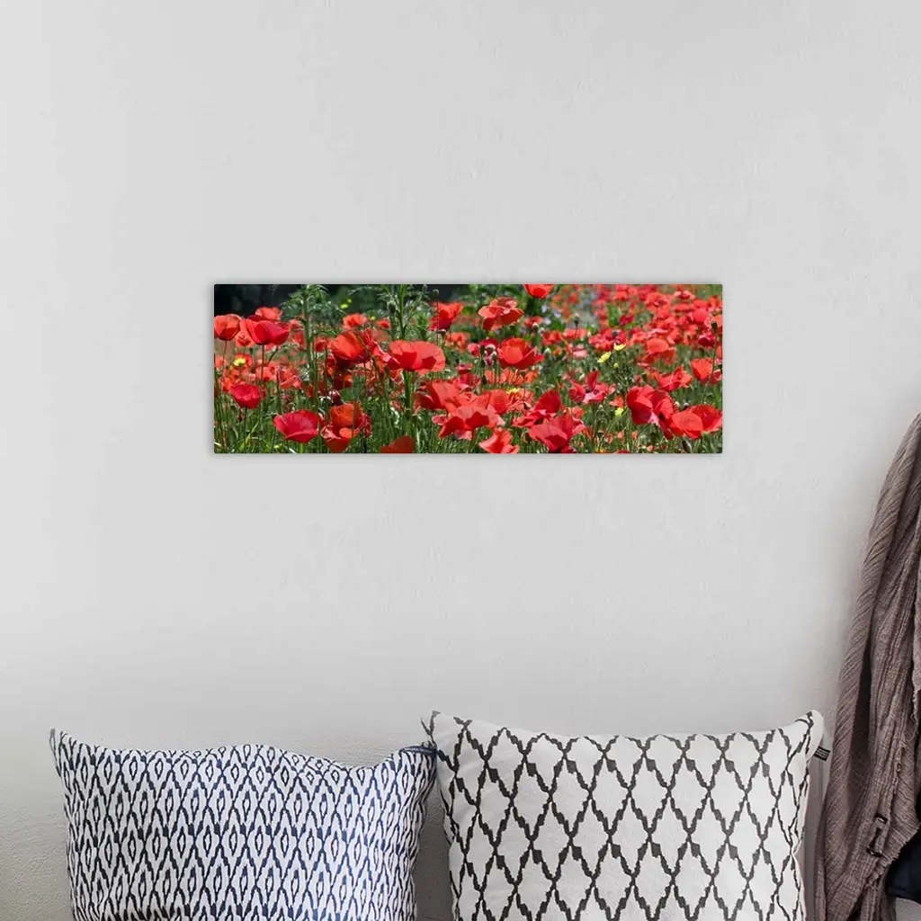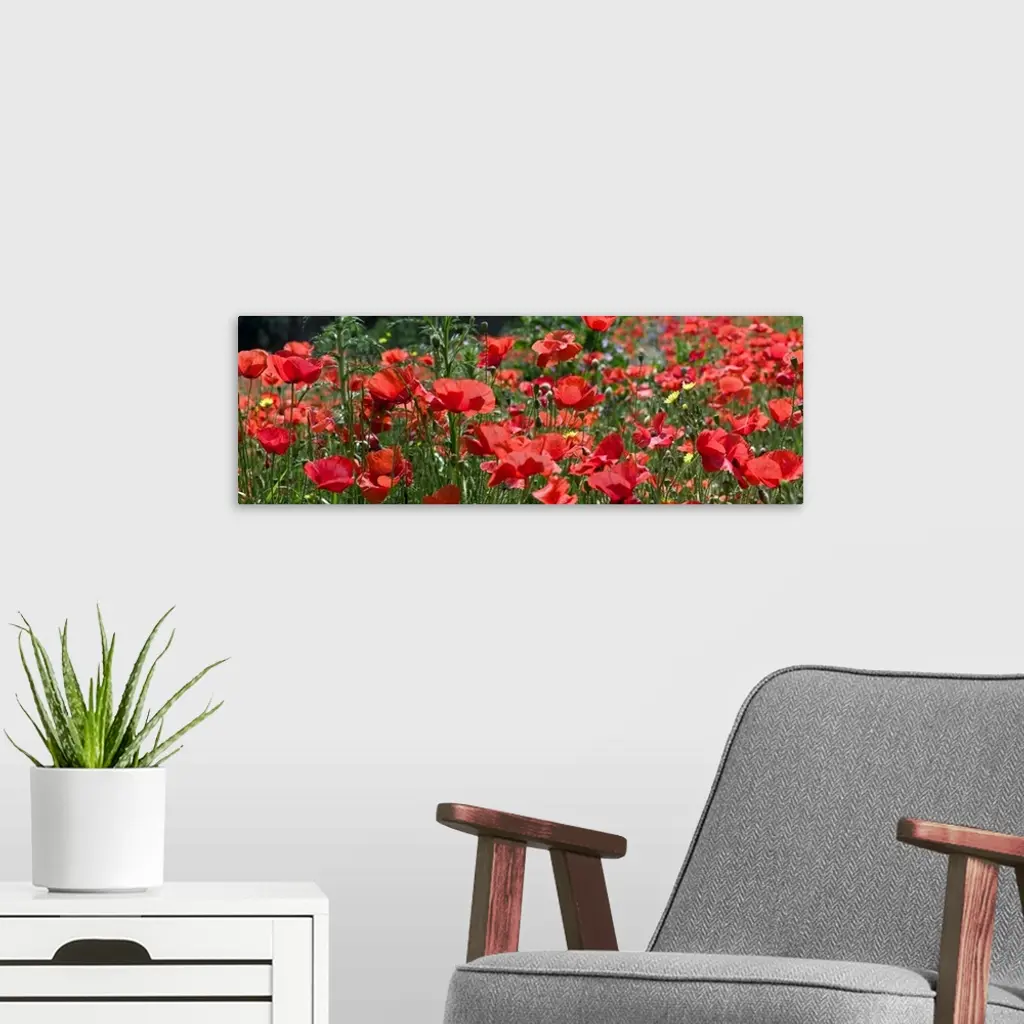Closeup panoramic photograph of a poppy field in Europe with other assorted grasses and growth.