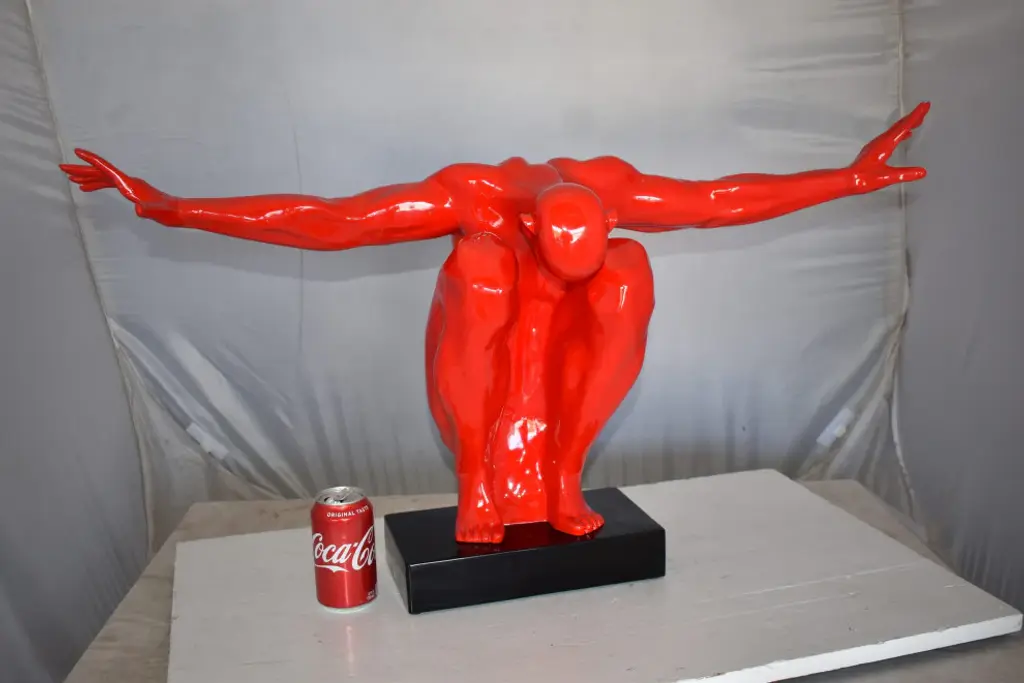 Enjoy this happy looking modern art of a red saluting body builder made of resin statue mounted on a base. This modern abstract would be a great addition to your home. Resin casting is a method of plastic casting where a mold is filled with a liquid synthetic resin, which then hardens. Get one for yourself or surprise a friend with an unforgettable gift! Size: 37"L x 14"W x 19"H. Weight is: 17Lb