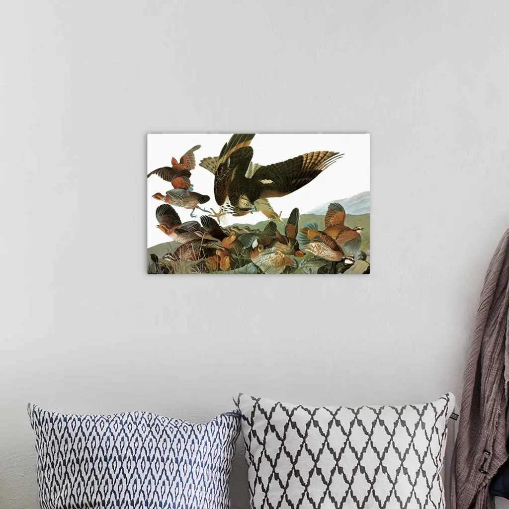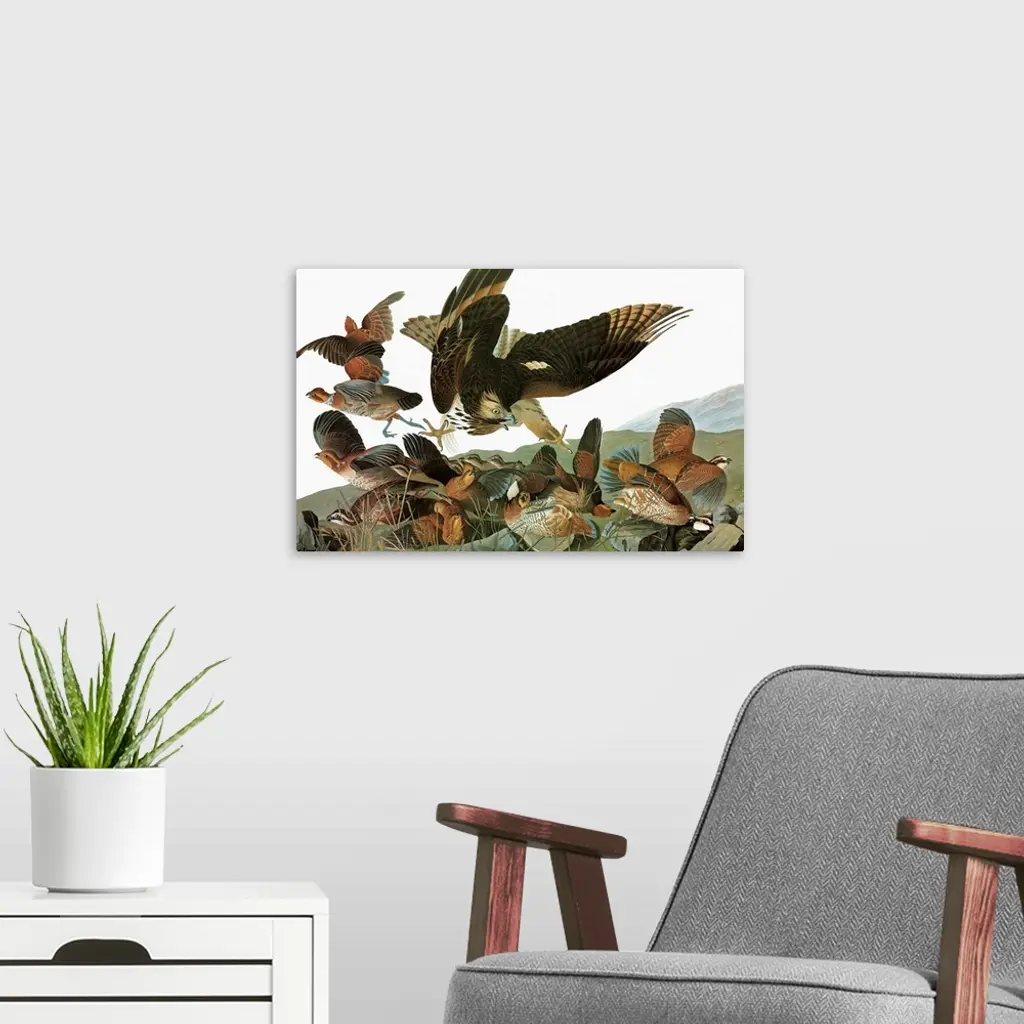 Red-shouldered Hawk (Buteo lineatus) and Northern Bobwhite, or Virginia Quail (Colinus virginianus). Engraving after John James Audubon for his 'Birds of America,' 1827-38.