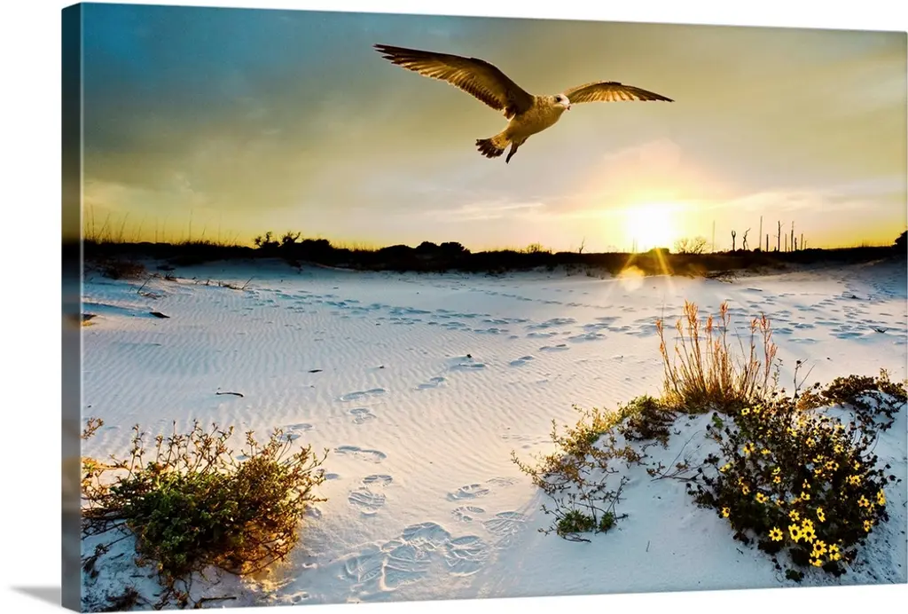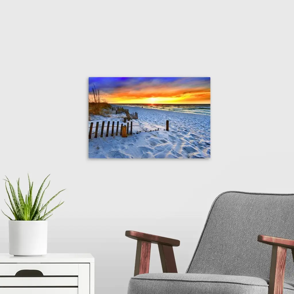 A dark burning red sunset on the beach in this beautiful landscape. A burning sun sets in the distant sea beyond a sandy shore.
