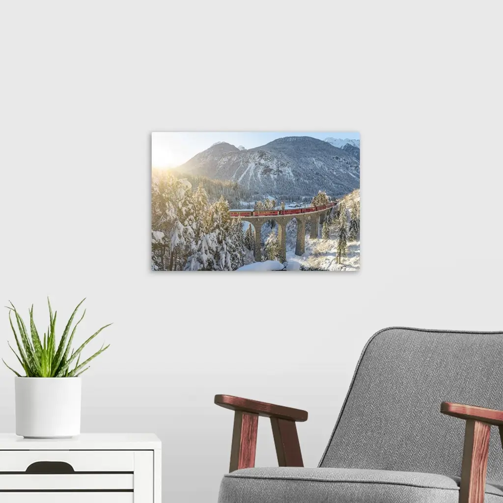 Red train traveling in the winter snowy landscape from Filisur to Tiefencastel railway station, aerial view, Graubunden, Switzerland