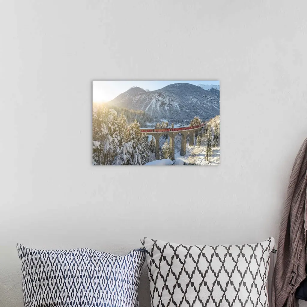 Red Train In Winter Landscape From Filisur To Tiefencastel Railway Station, Switzerland