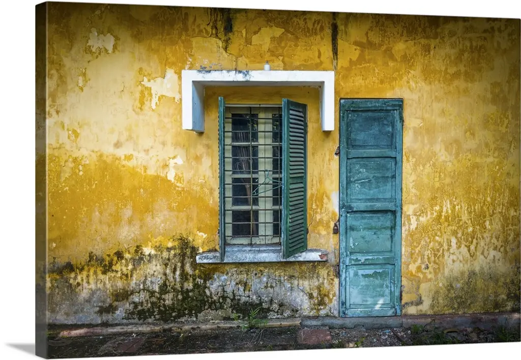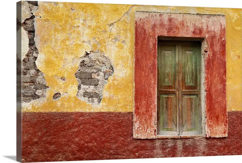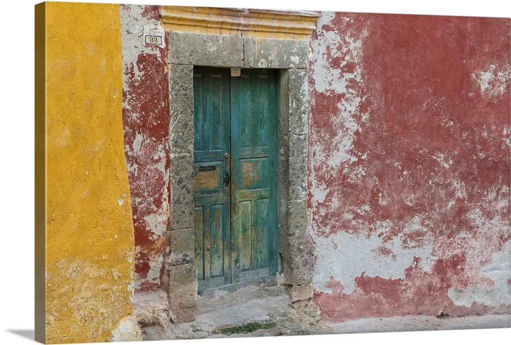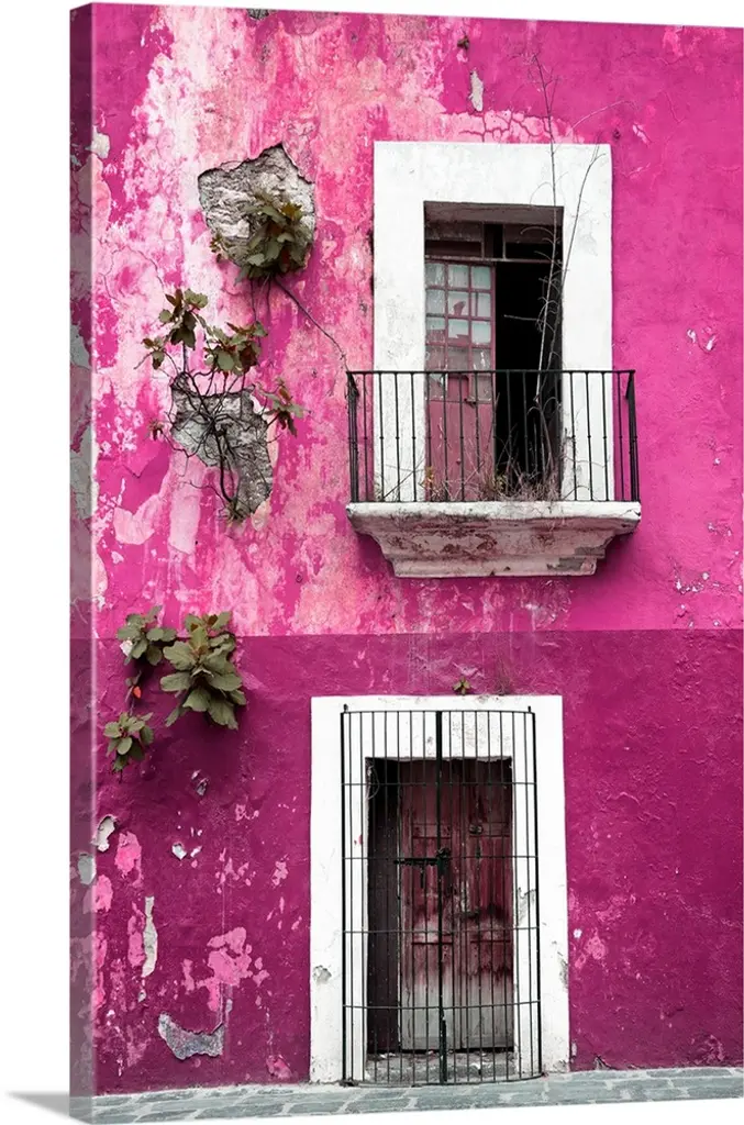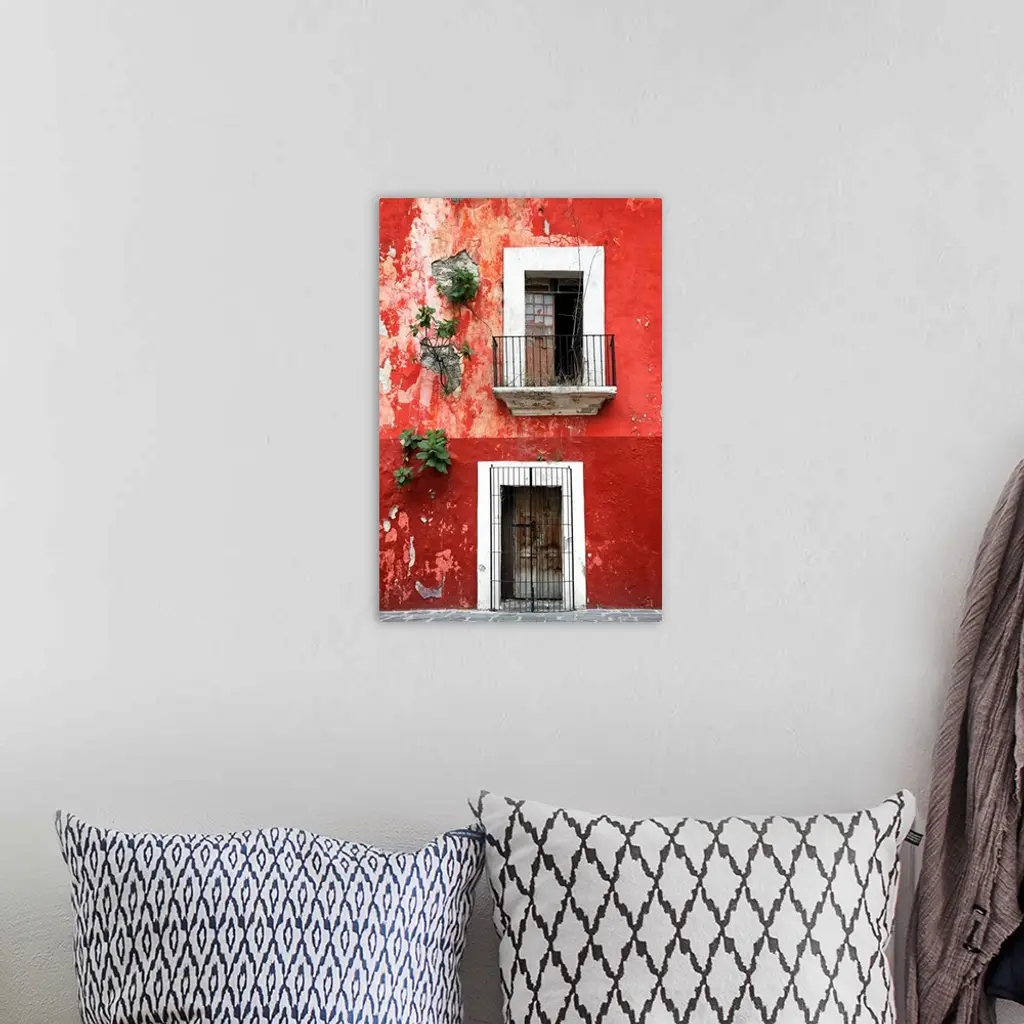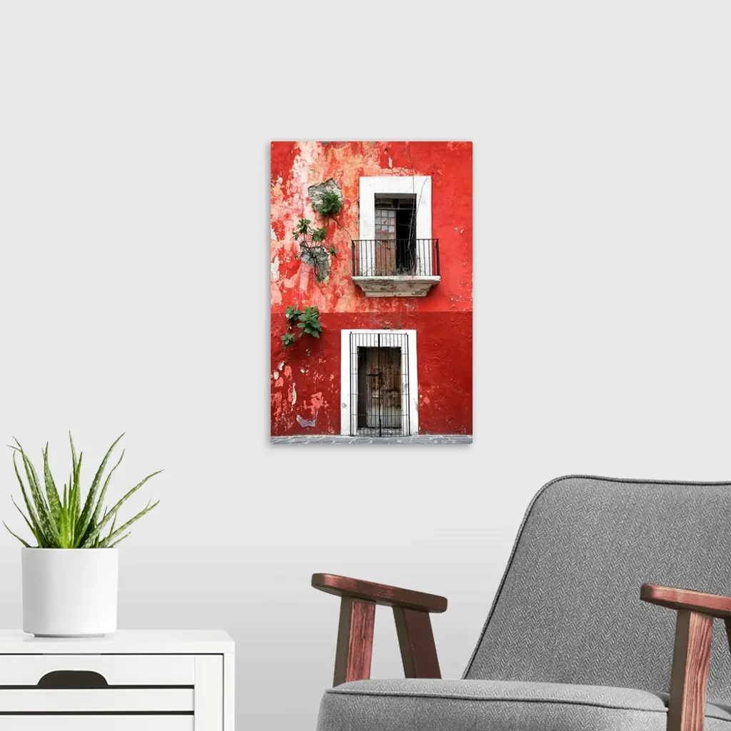 Photograph of a rustic red wall in Mexico with peeling paint, a balcony, door, and plants growing out of the wall. From the Viva Mexico Collection.