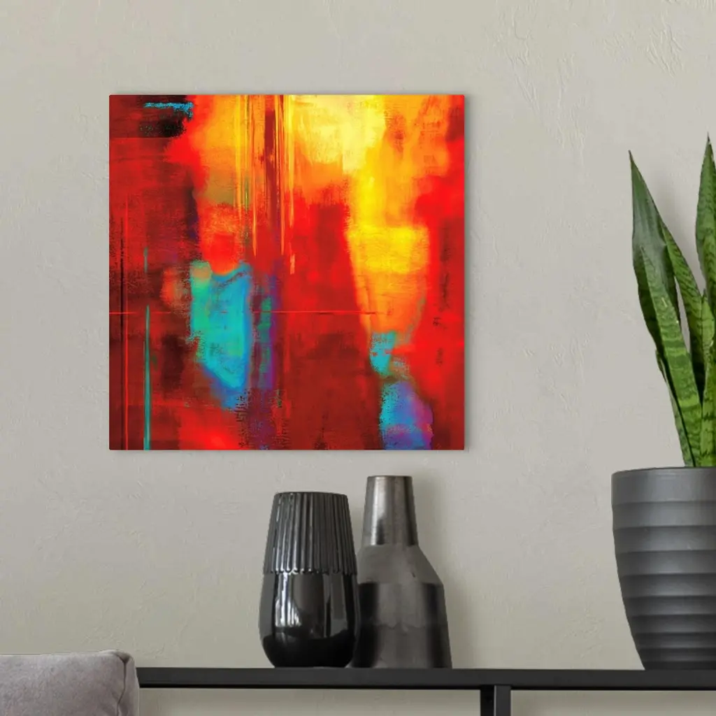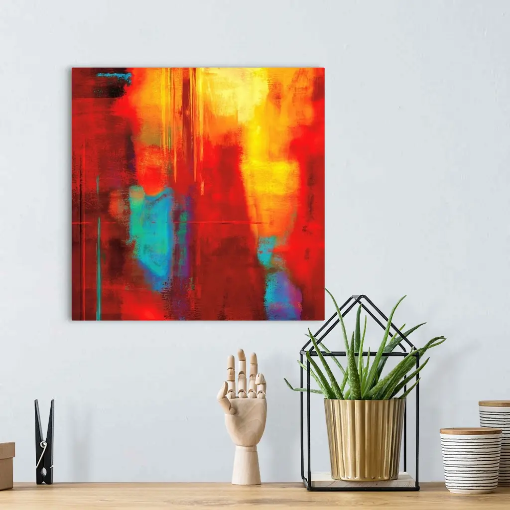 Bright red square abstract art with cool hints of blue, green, and purple.