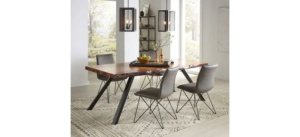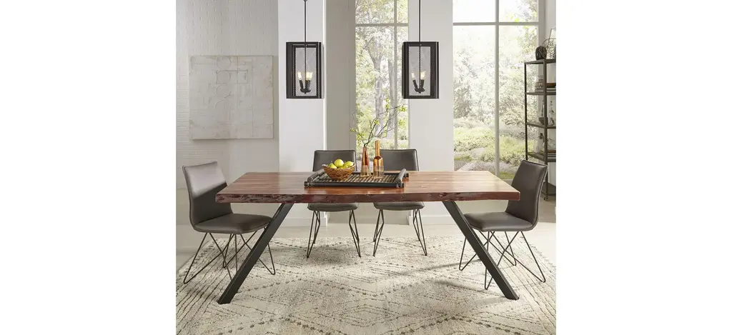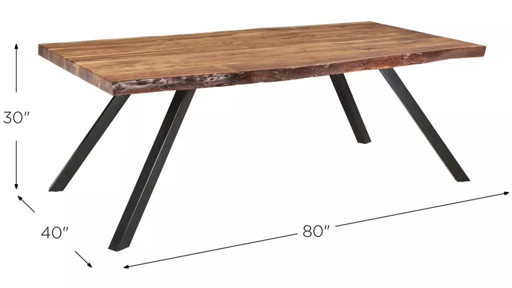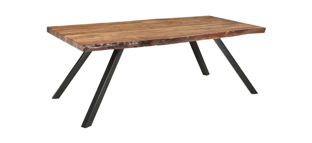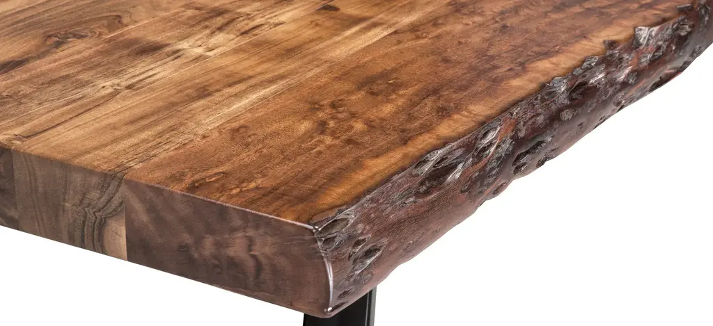Reese Dining Table in natural acacia. Made from 2-inch thick planks of solid acacia wood and powder-coated iron, the Reese table top is finished and sealed with a clear semi-gloss NC lacquer to preserve its genuine tree edges and unique wood grain. The nature of the wood and live edges ensures each table is one-of-a-kind, with random edge profiles, knots, cracks and varied grain patterns shining through sundry hues.