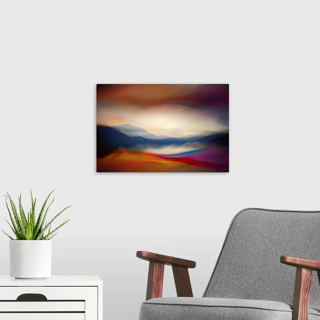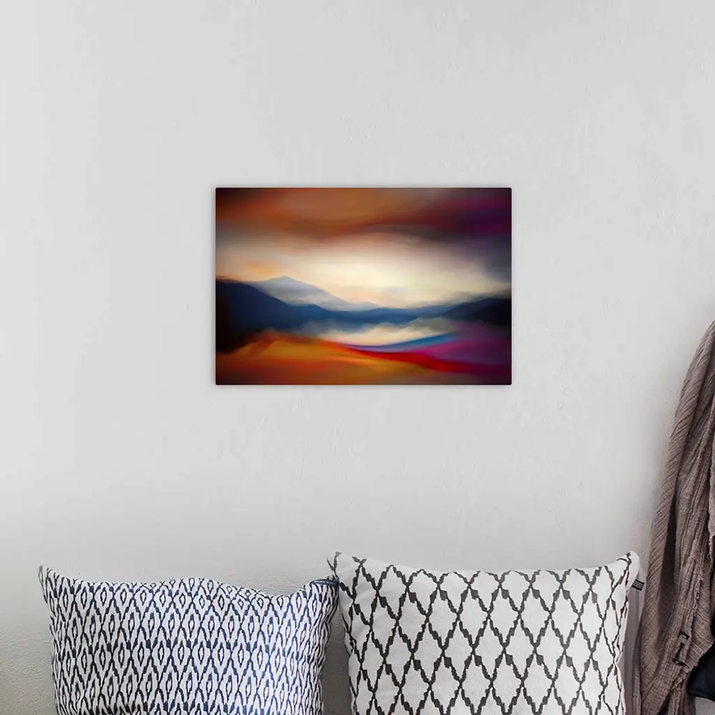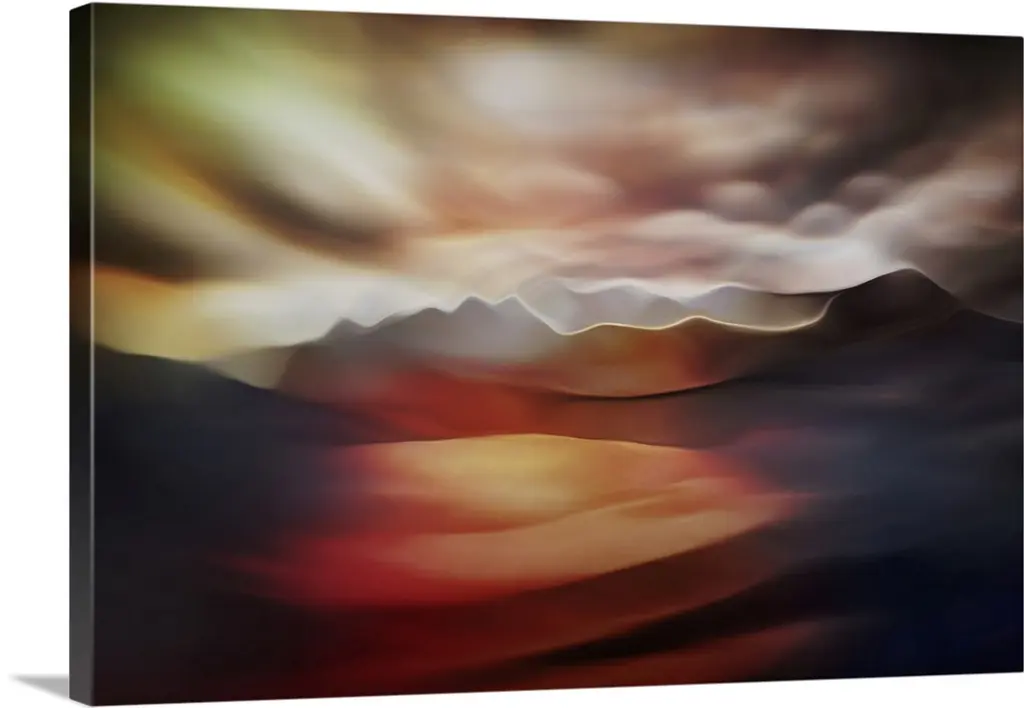 Abstract image of Slocan Lake, giving an impression of a sunset over the lake. The image is a combination of two exposures, one of the lake made using the ICM(Intentional Camera Movement) technique, the second a colourful closeup of water made in studio. The shapes are created by the image of the lake, the colors and texture come from the second image. Ursula Abresch Fantastic Landscapes Collection.