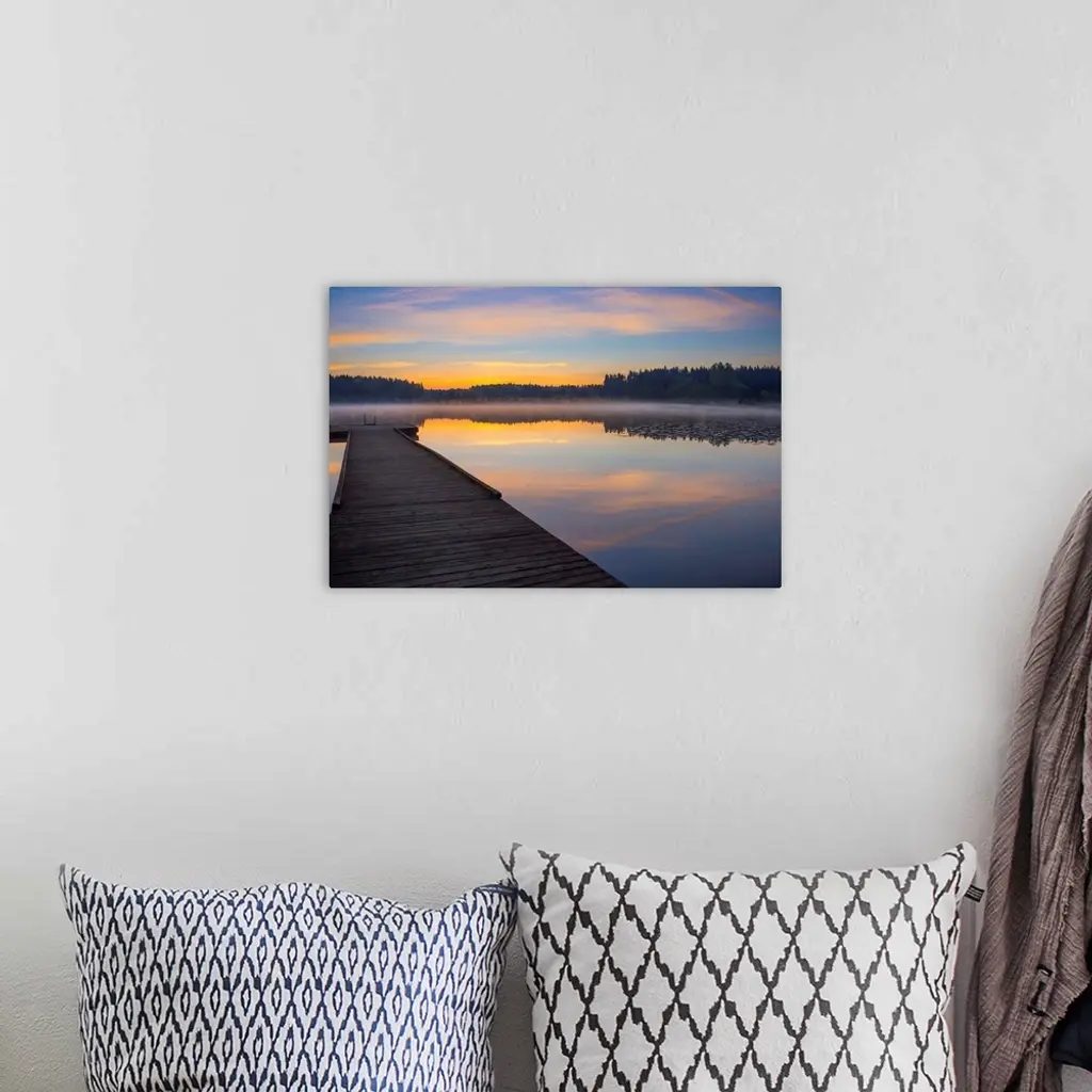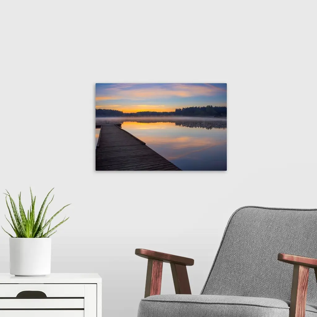 Reflection of a beautiful serene sunrise on peaceful Scott lake, Washington, United States of America.
