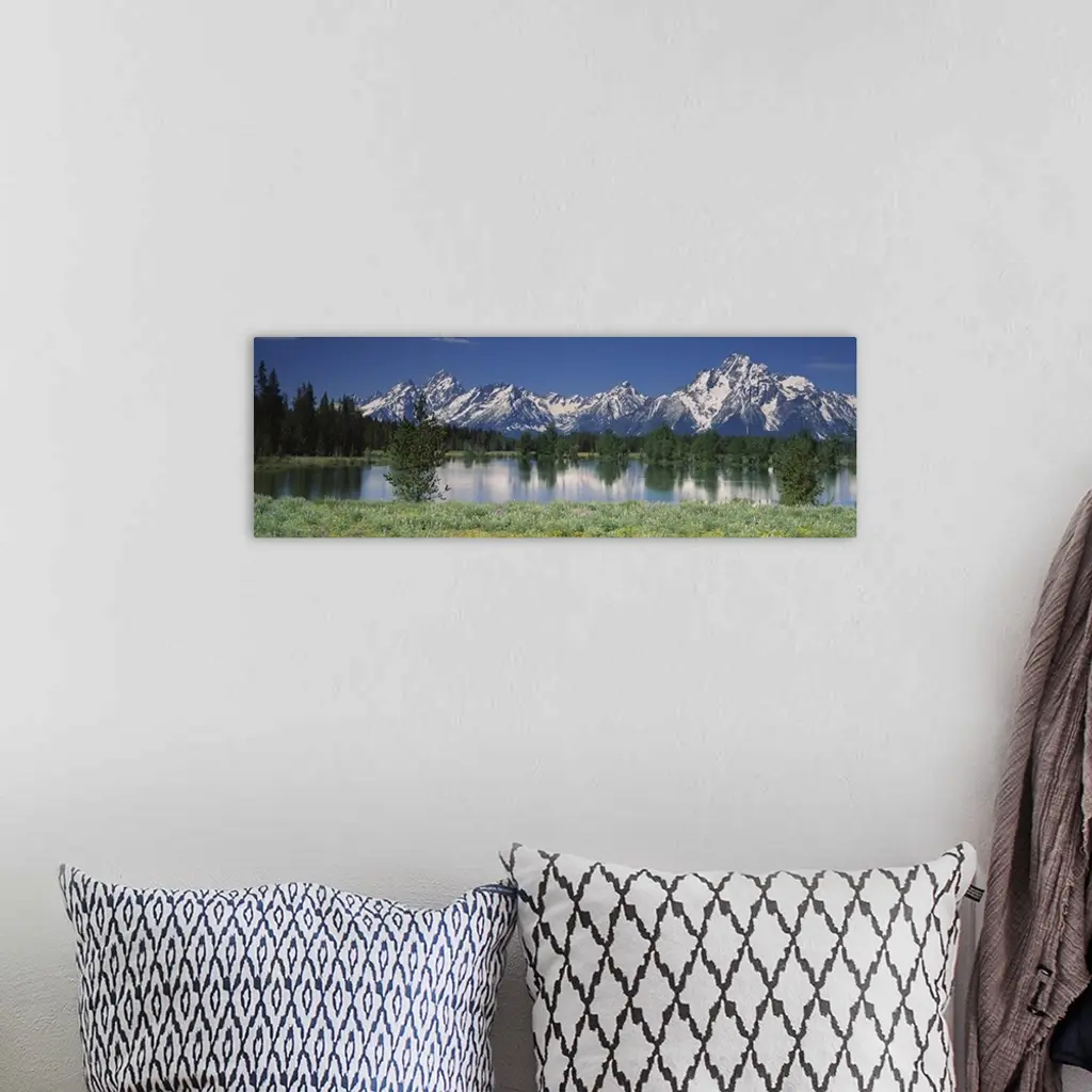 Reflection Of A Mountain Range And Pine Trees In Water, Grand Teton National Park, Wyoming