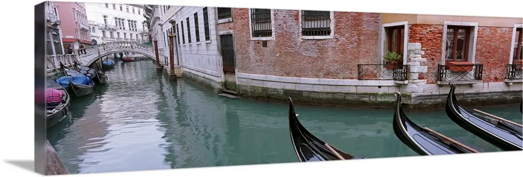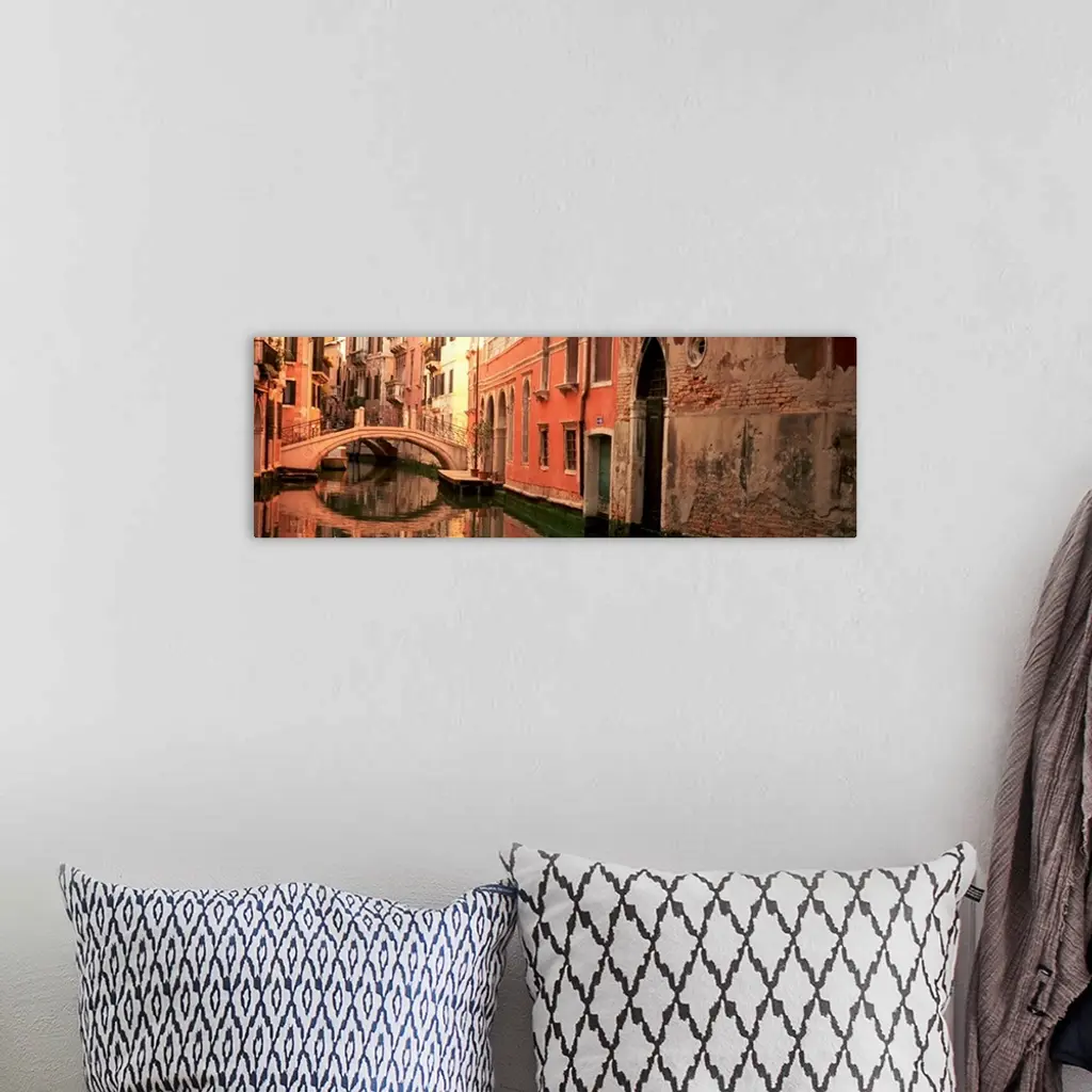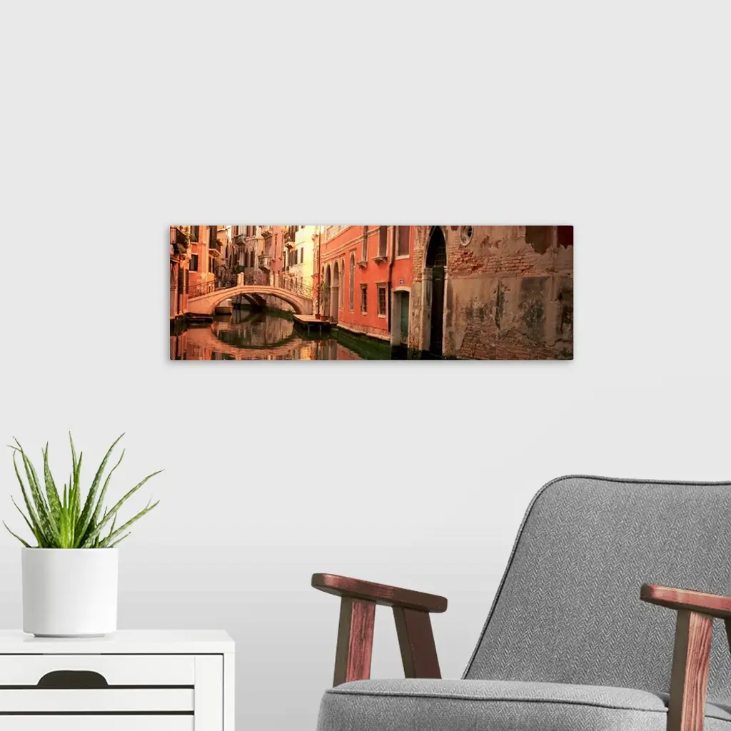 Panoramic photograph focuses on buildings and bridges following a canal in Venice, Italy. Located on the surface of the water you can see the reflection of the structures above it.