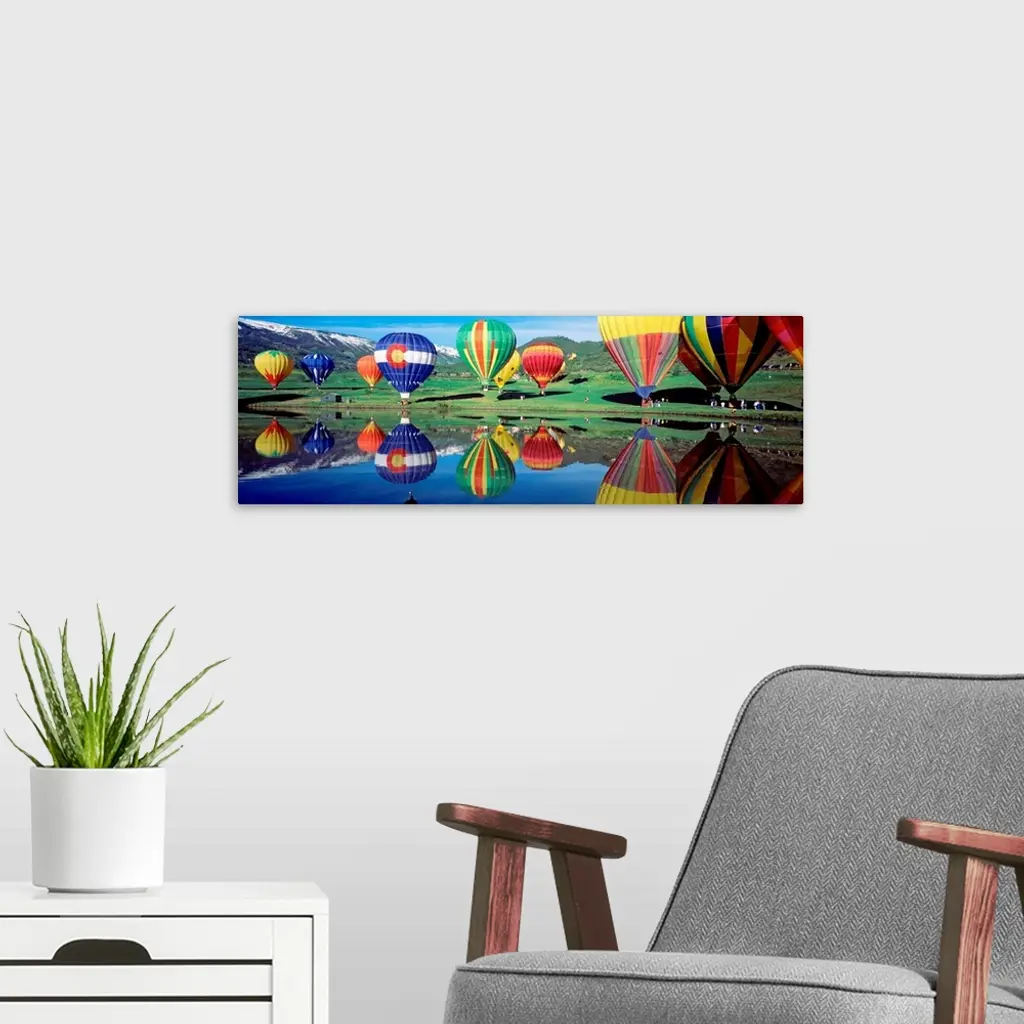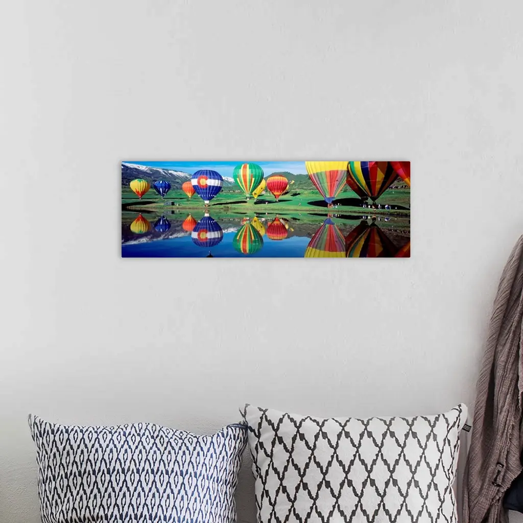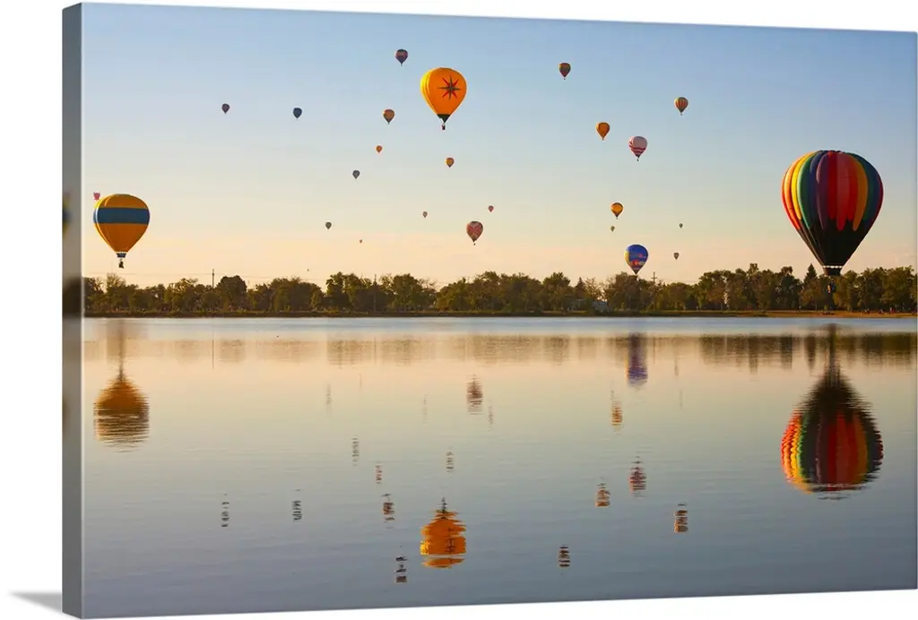 Vividly colored vehicles for the aeronautical sport gather around a lake and reflecting in the water.