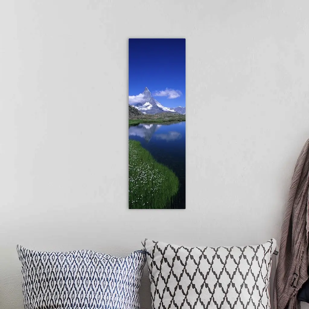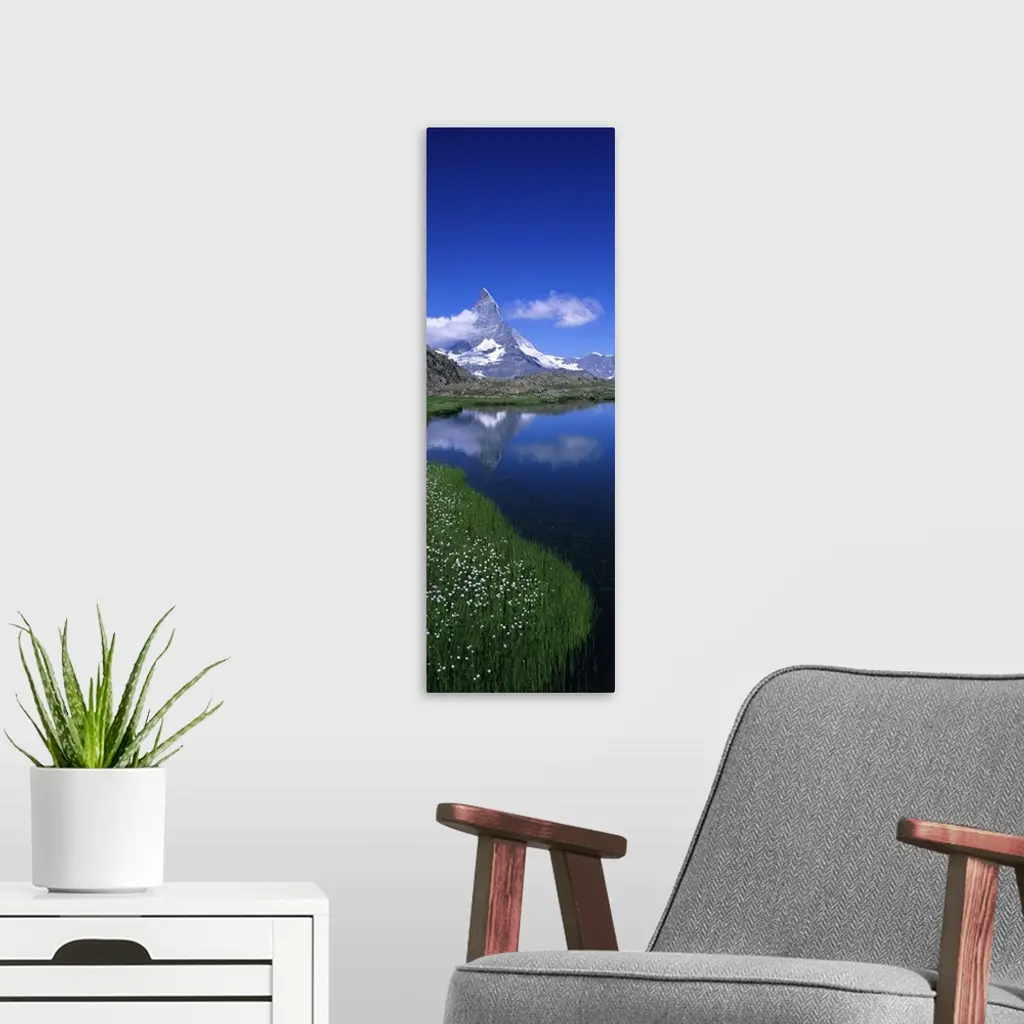 Reflection of mountain in water, Riffelsee, Matterhorn, Switzerland wall art for home and office decor. Discover canvas art prints, photos, mural, big canvas art and framed wall art in GreatBigCanvas.com's varied collections.