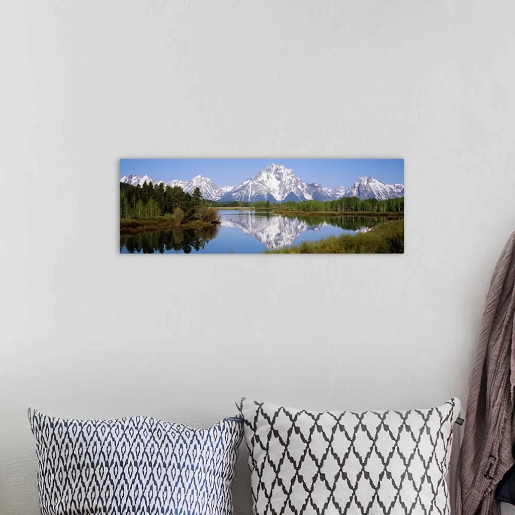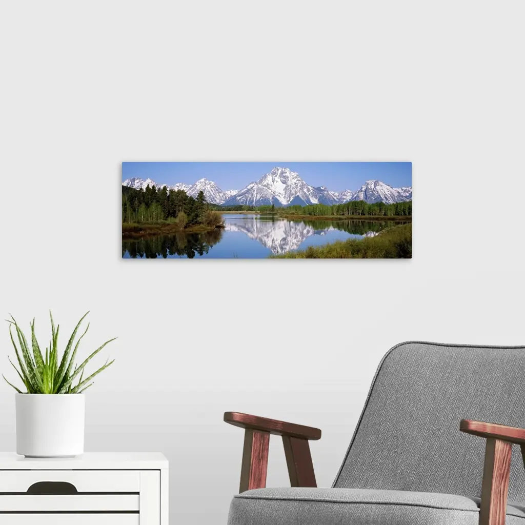 Panoramic photograph on a giant canvas of mountain reflections in the Snake River, surrounded by forest in the Grand Teton National Park, Wyoming.
