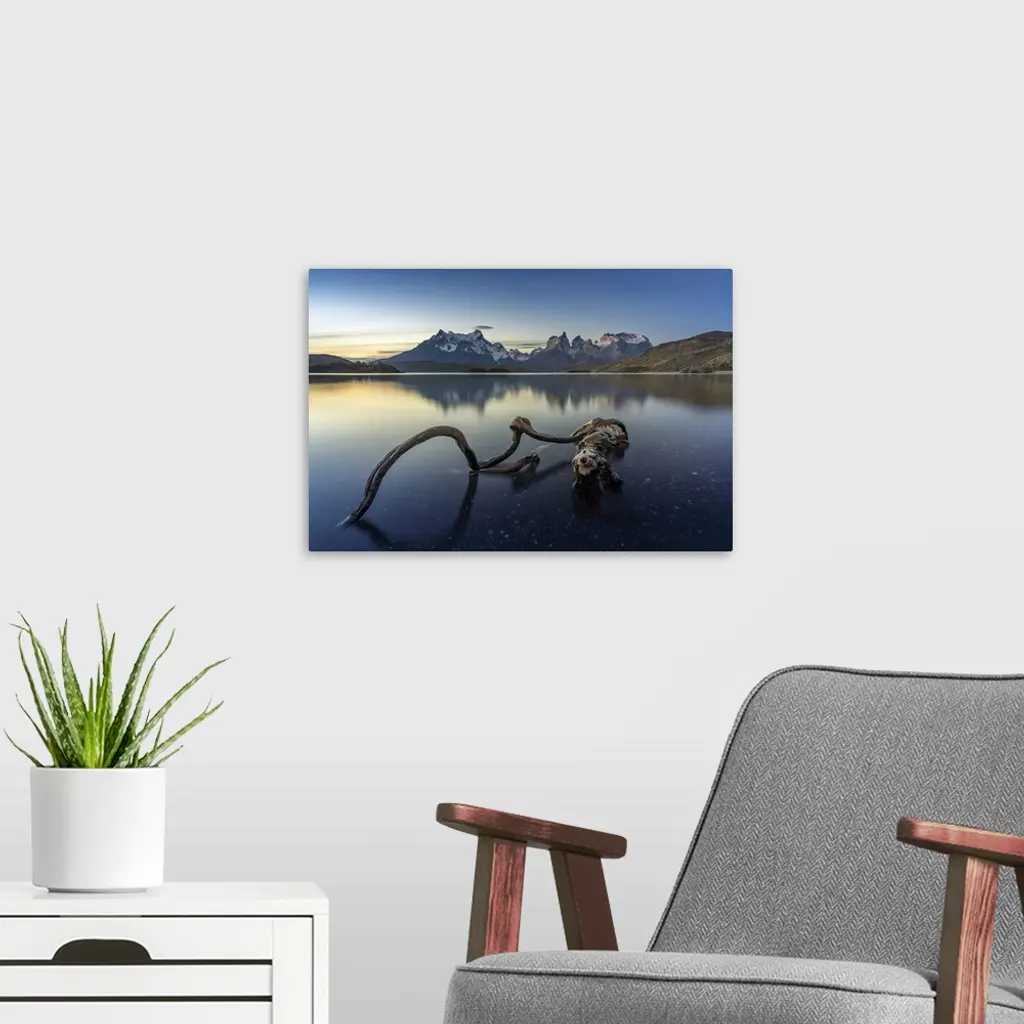 Sunset reflection of the Paine range peaks on Lake Pehoe. Torres del Paine National Park, Ultima Esperanza province, Chile.