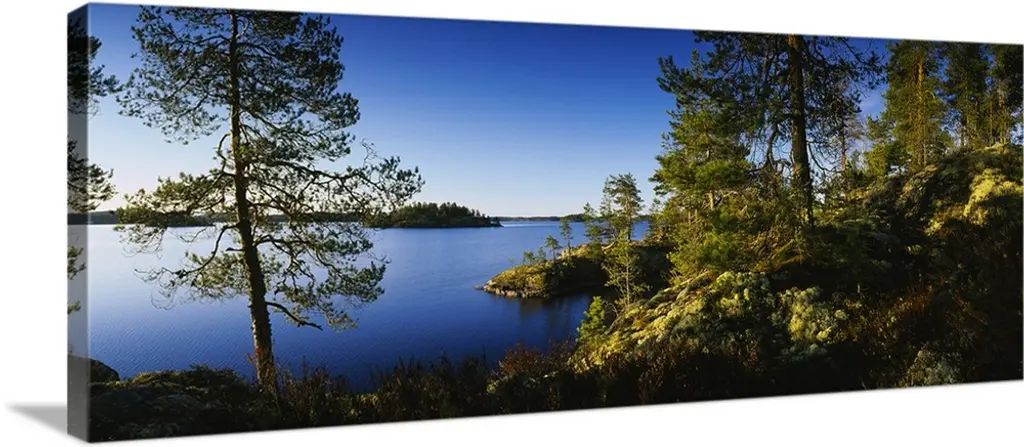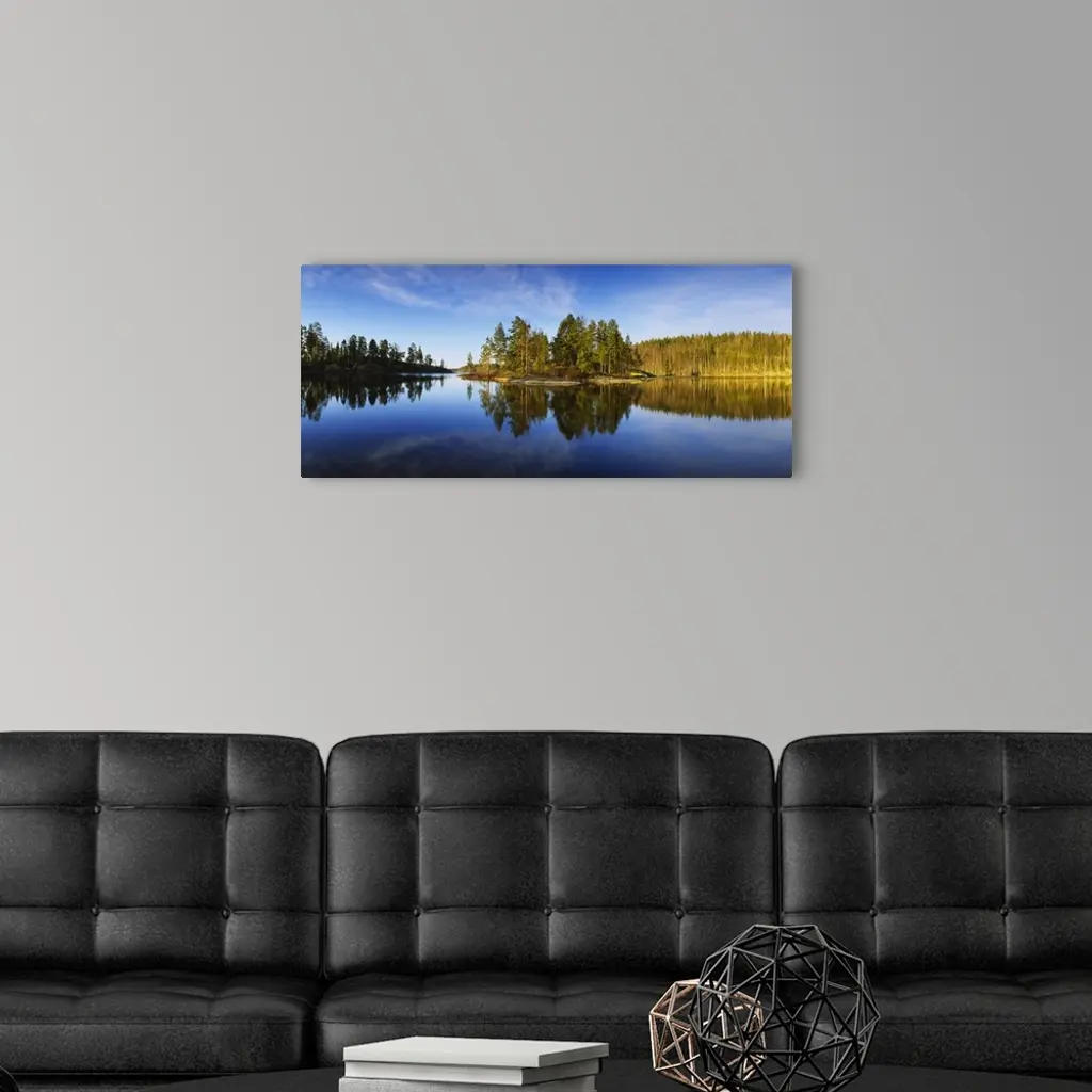 Reflection of trees in a lake, Lake Saimaa, Puumala, Finland wall art for home and office decor. Discover canvas art prints, photos, mural, big canvas art and framed wall art in GreatBigCanvas.com's varied collections.