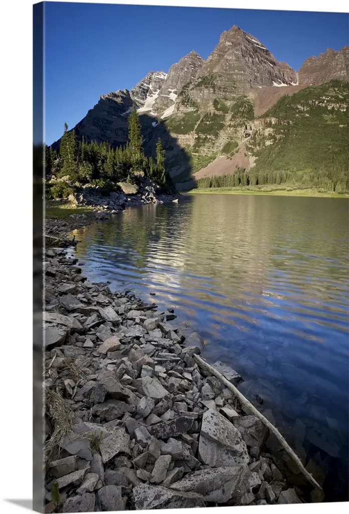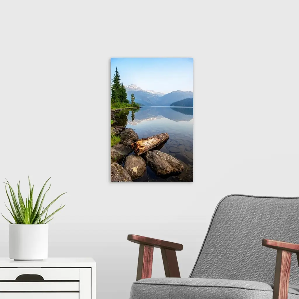 Reflection on Callaghan Lake with Rocks in British Columbia, Canada.