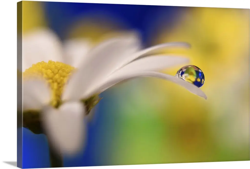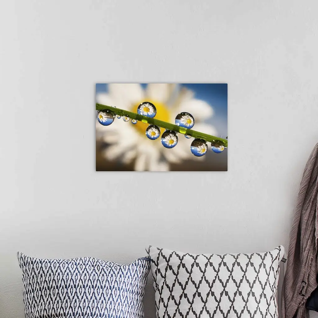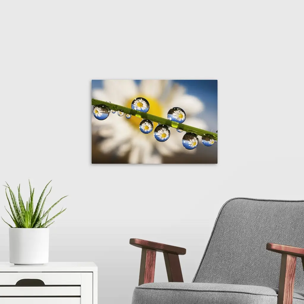 Dew drops on a blade of grass, reflecting a daisy inside.