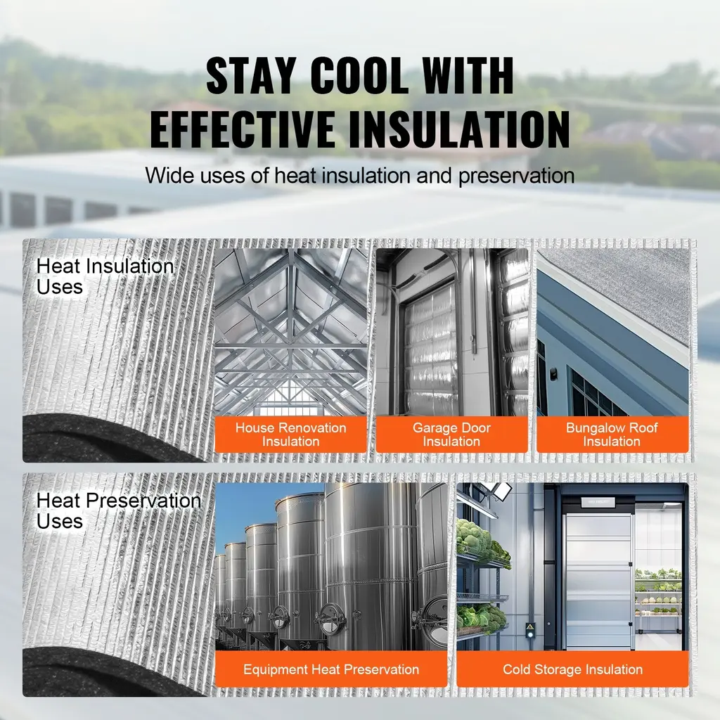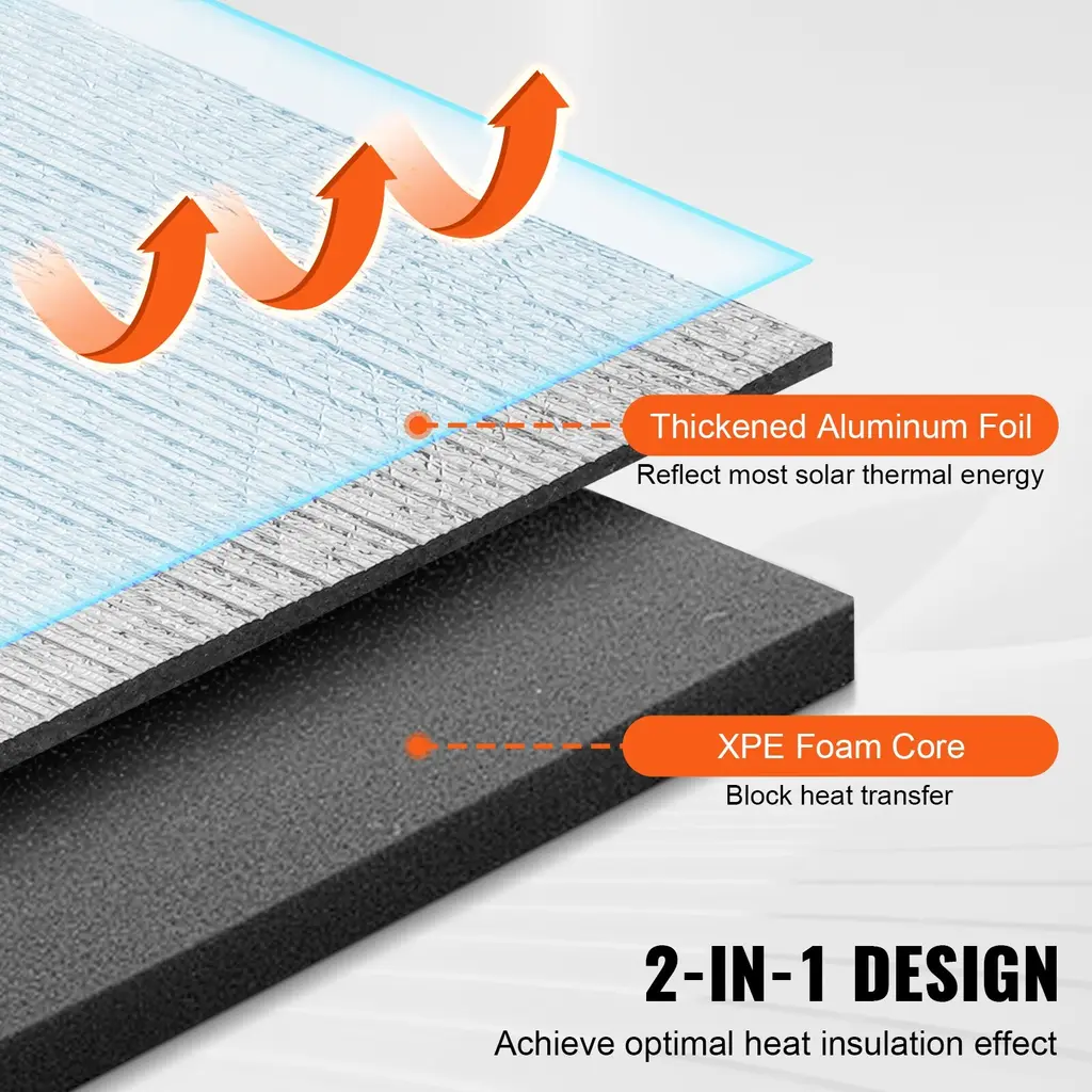 Excellent Insulation Performance: Crafted from high quality aluminum foil and XPE foam core, our 10.3 mm thickened reflective insulation roll efficiently reflects sunlight and blocks heat transfer in summer, while preventing indoor heating loss in winter. Stay cool in summer, keep warm in winter! Reflects Over 95% of Heat: Featuring high-density aluminum foil coating with outstanding heat reflectivity, this aluminum foil XPE foam core insulation roll efficiently reflects more than 95% of solar heat. Experience rapid heat dissipation, keeping your space cool and comfortable during hot days. Peel and Stick, Easy Installation: Easily install our heat reflective radiant barrier with its built-in strong adhesive backing. Simply peel off the backing and stick it into place, making installation a breeze. Perfect for quick and hassle-free application in various settings. Flexible Cutting: This XPE foam core radiant barrier is easy to cut and install. It is convenient to DIY the roll size and shape to meet your different needs. When not in use, it can be easily folded up for space-saving and convenient carrying. Versatile Applications: Our 5 ft x 40 in thermal insulation heat shield is tear and puncture-resistant, scratch and wear-resistant, strong and lightweight. It's perfect for windows, garage doors, RVs, houses, roofs, etc, offering effective heat blocking and insulation wherever needed. Package Content 1 x Reflective Insulation Roll
