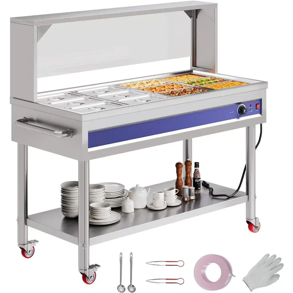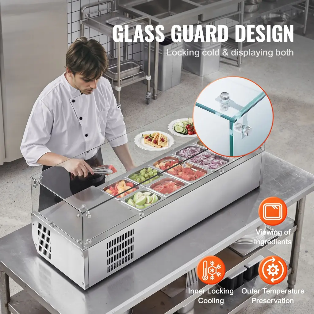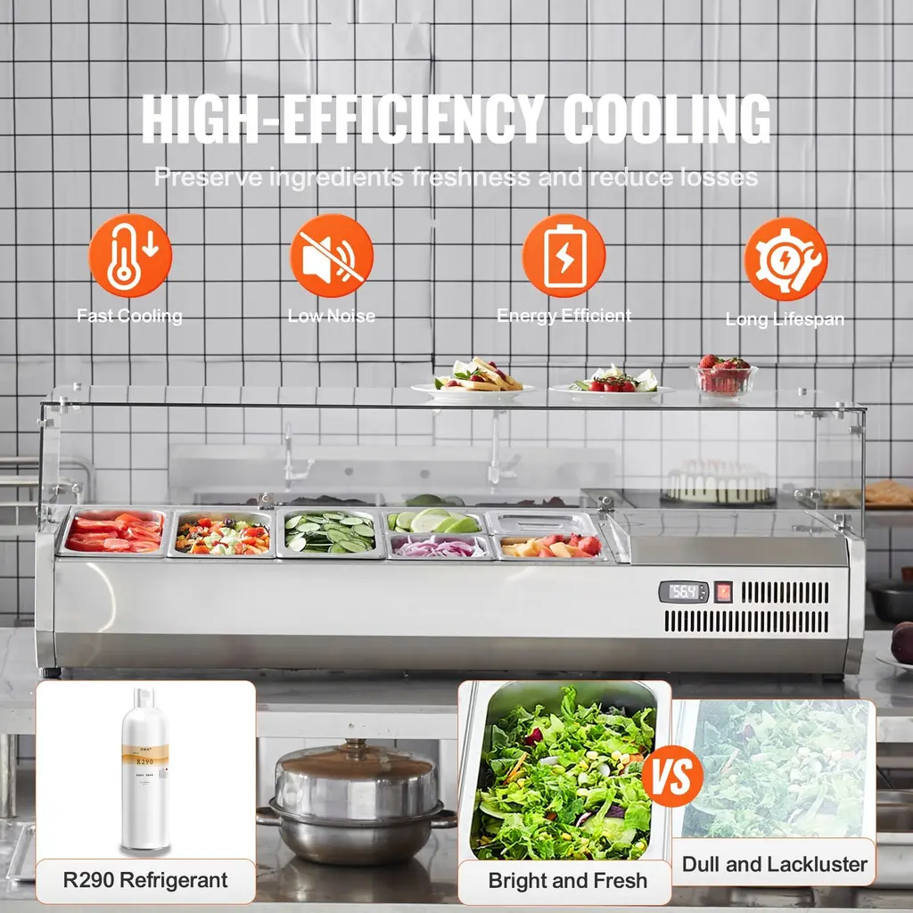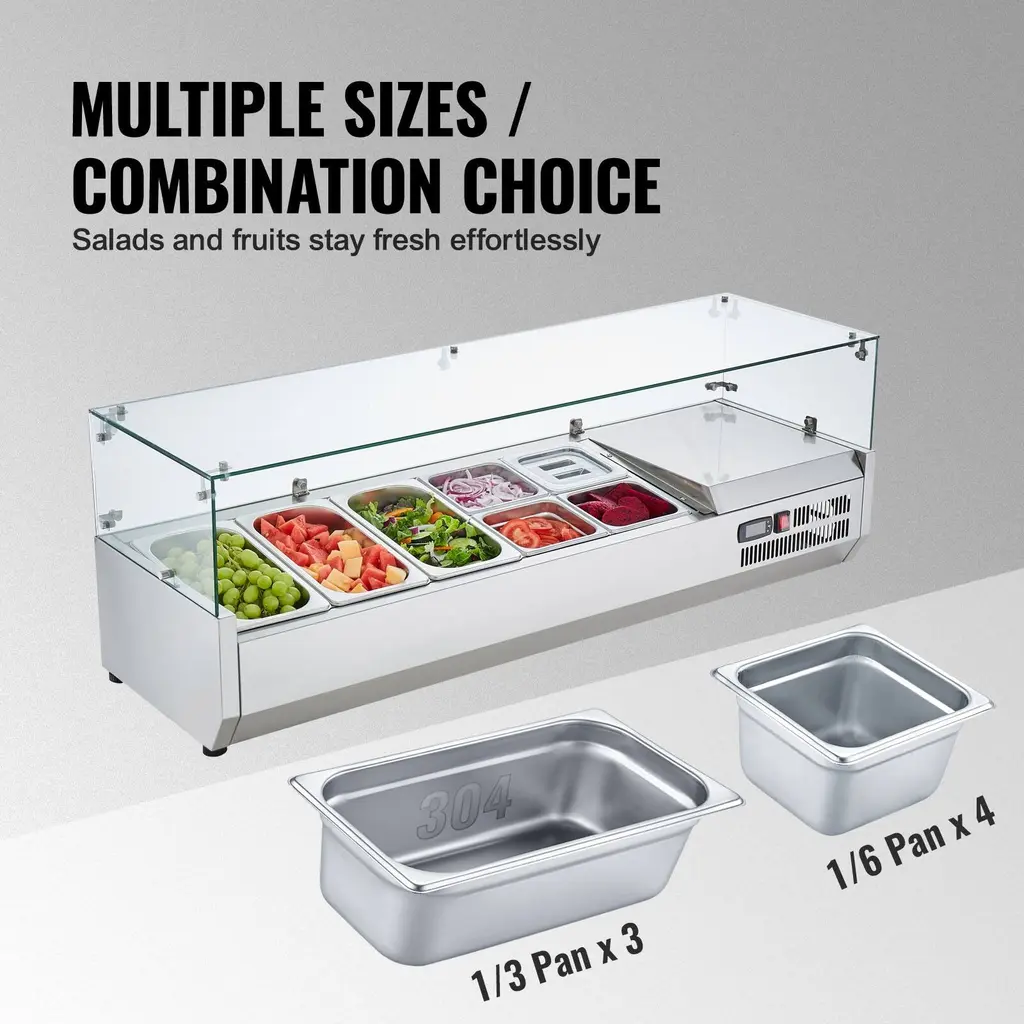 Efficient Cooling: A powerful 140W compressor ensures that condiments, sandwich toppings, and salad ingredients are kept at the proper temperature. Paired with R290 refrigerant, it offers reliable cooling effects, locks in the nutrients and moisture of the food, and operates quietly and efficiently. It is undoubtedly an ideal choice for commercial use. Please ensure the electrical environment is suitable—voltage frequency AC115V 60Hz, rated current 1.95A. Modular Tray System: Our refrigerated condiment station features 3 1/3 pans and 4 1/6 pans, increasing capacity for flexible use. Removable dividers help you reasonably segregate the areas to prevent flavor crossover and keep ingredients fresher. Made from 304 stainless steel and includes PC material bins with sealing lids to prevent dust and insects. Safe and reliable, you can also choose different sized pans as needed to meet your diverse food storage & display requirements. One-Touch Defrost: The refrigerated condiment prep station has a real-time temperature display for more accurate control. The digital LED panel shows precise temperatures, which you can set between 35.6 ℉ and 46.4 ℉. Additionally, it features a one-touch defrost function to ensure smooth airflow in the water tank, eliminating the hassle of manual defrosting and reducing condensation. Glass Guard: Sturdy and safe glass shield, attractive and transparent for excellent display quality and easy visibility of ingredients. It also features internal cooling and external heat insulation, scratch-resistant and easy to clean. Comes with all necessary installation accessories, and you can quickly install the shield following the instructions provided in our manual. Durable and Easy to Maintain: CE/ETL certified for quality assurance, The refrigerated condiment prep station featuring a 201 stainless steel base and frame that resists corrosion and rust. It also provides extra space for tools/utensils, secure heat dissipation. Please note it should be used during business hours to maintain the low temperature and freshness of pre-cooled food, and not for continuous or extended storage. Package Content 1 x Countertop Refrigerated Prep Station 20 x Decorative Screws M6*14 20 x Decorative Screw Damping Rings 20 x Decorative Nuts M6*8 5 x Two-point Glass Clamps 2 x Three-point Glass Brackets 1 x Instruction Manual