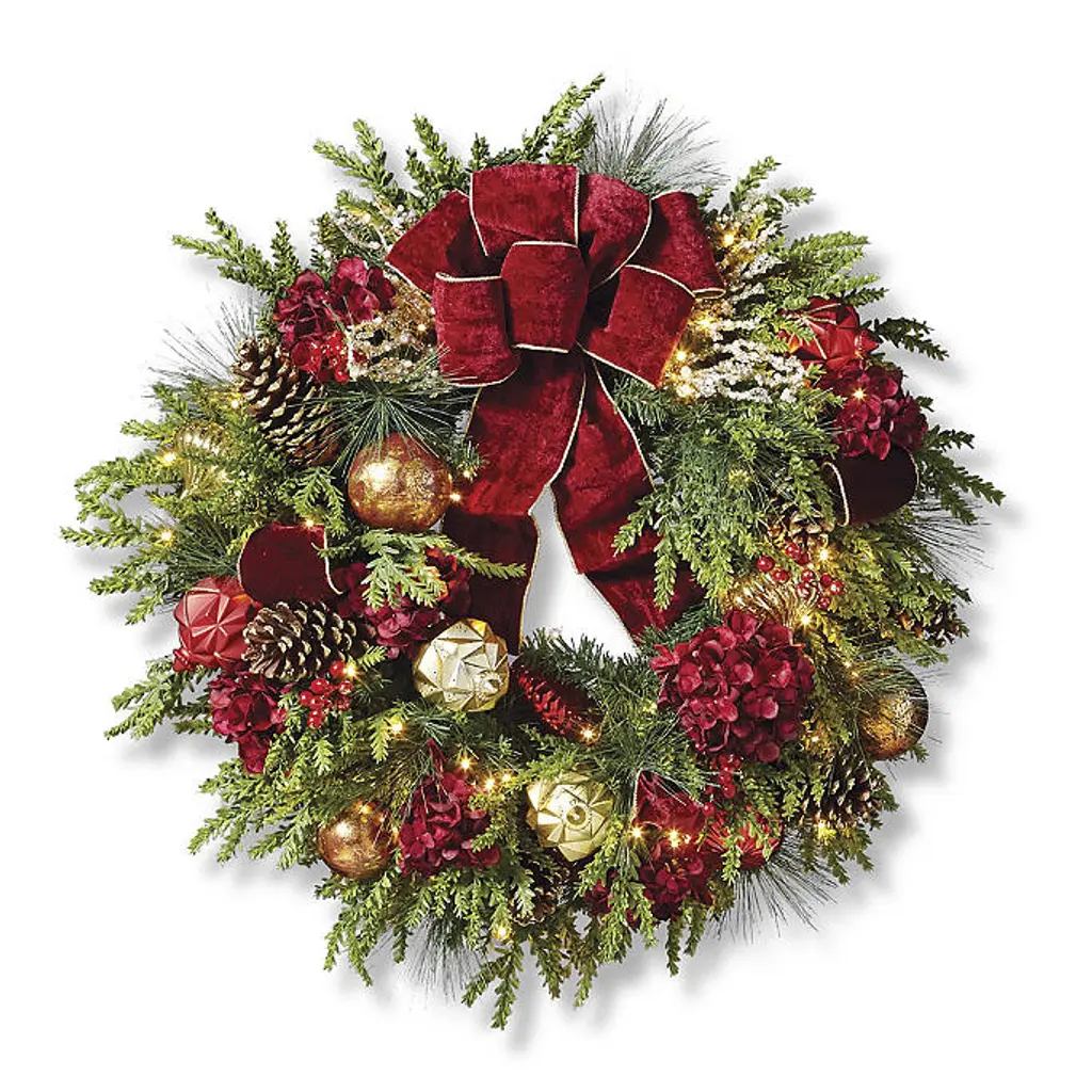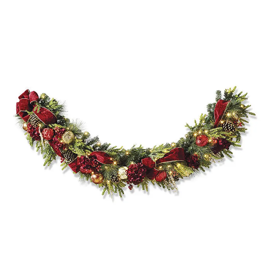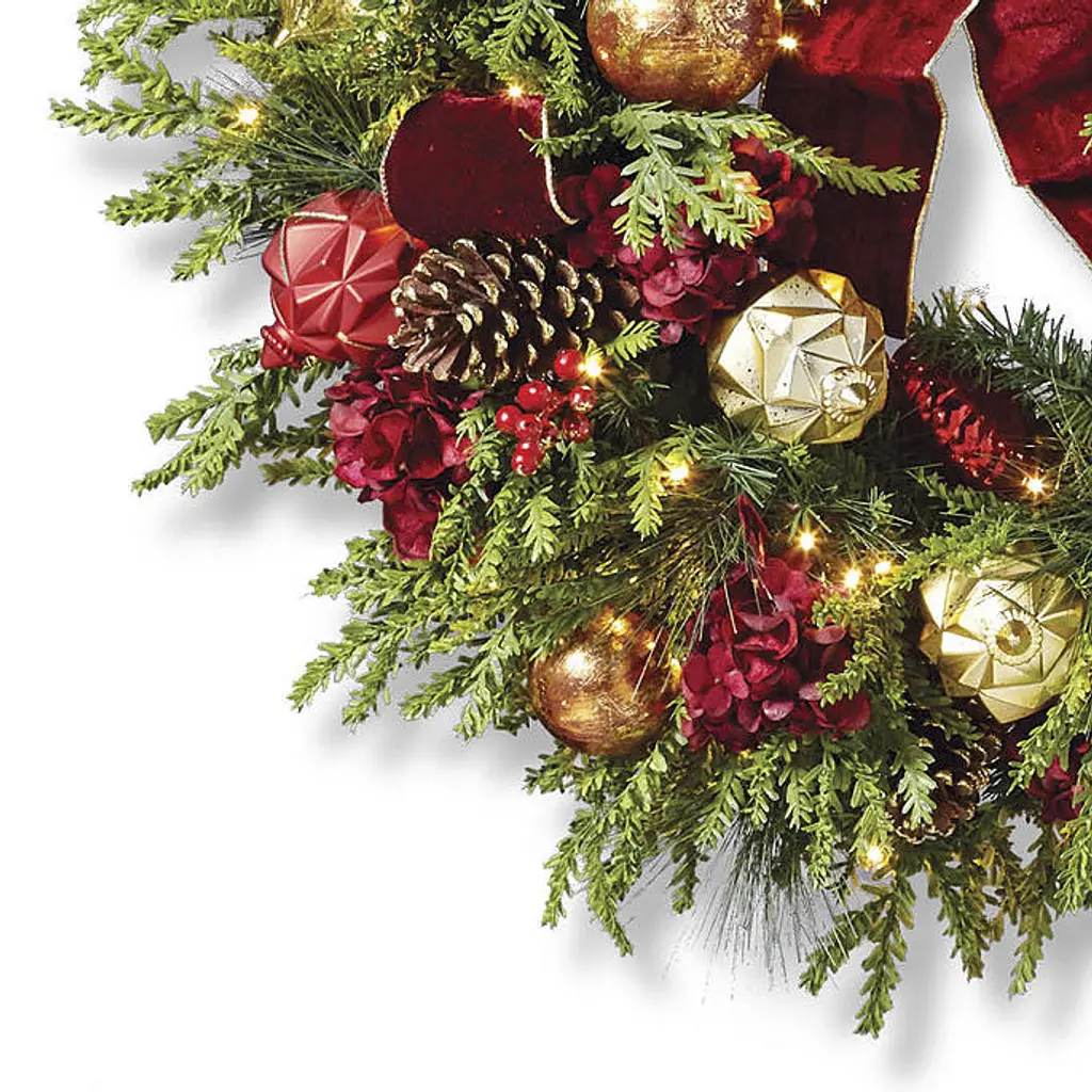 In a beautiful balance of regal splendor and natural beauty, lifelike greenery is exquisitely embellished in burgundy and gold. The Regal Splendor Greenery Collection is richly appointed with textured ornaments, jeweled picks, gilded pine cones and faux hydrangeas and berries. From the gold-trimmed velvet ribbon to the warm-white, short-tip LED lights, every element is carefully arranged by hand for a full, dramatic look. For covered outdoor or indoor use Lifelike cypress and pine, polyester velvet ribbon and hydrangeas, berries and natural pine cones Shatterproof ornaments Warm-white, short-tip LED lightsWreath has 100 lights, 140 tips6 ft. Garland has 120 lights, 150 tipsSwag has 60 lights, 150 tips Built-in timer option automatically turns the lights on for eight hours and off for 16 hours Fluff and shape greenery after unpacking To maximize the life of your greenery, we recommend a limit of 3 months of outdoor exposure per year Requires three "D" batteries (not included) Imported A Frontgate exclusive. At Frontgate, our primary focus is quality. We guarantee that every product we sell will stand up to the supreme test – our customers' satisfaction. To learn more about our policies, visit our Shipping & Processing, Returns & Exchanges and Warranty & Price Guarantee pages.