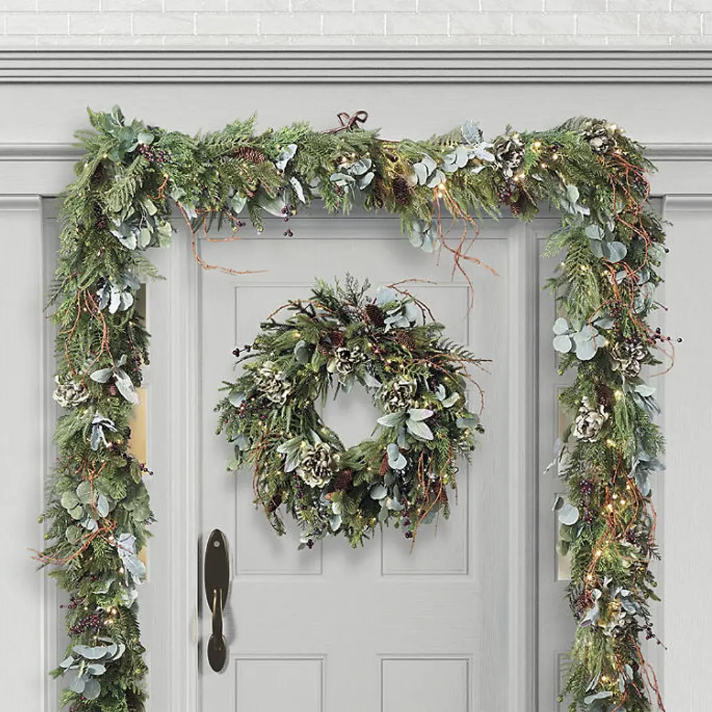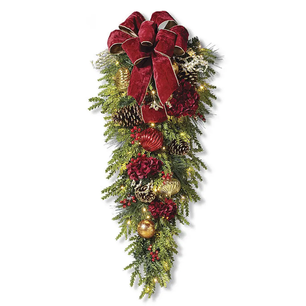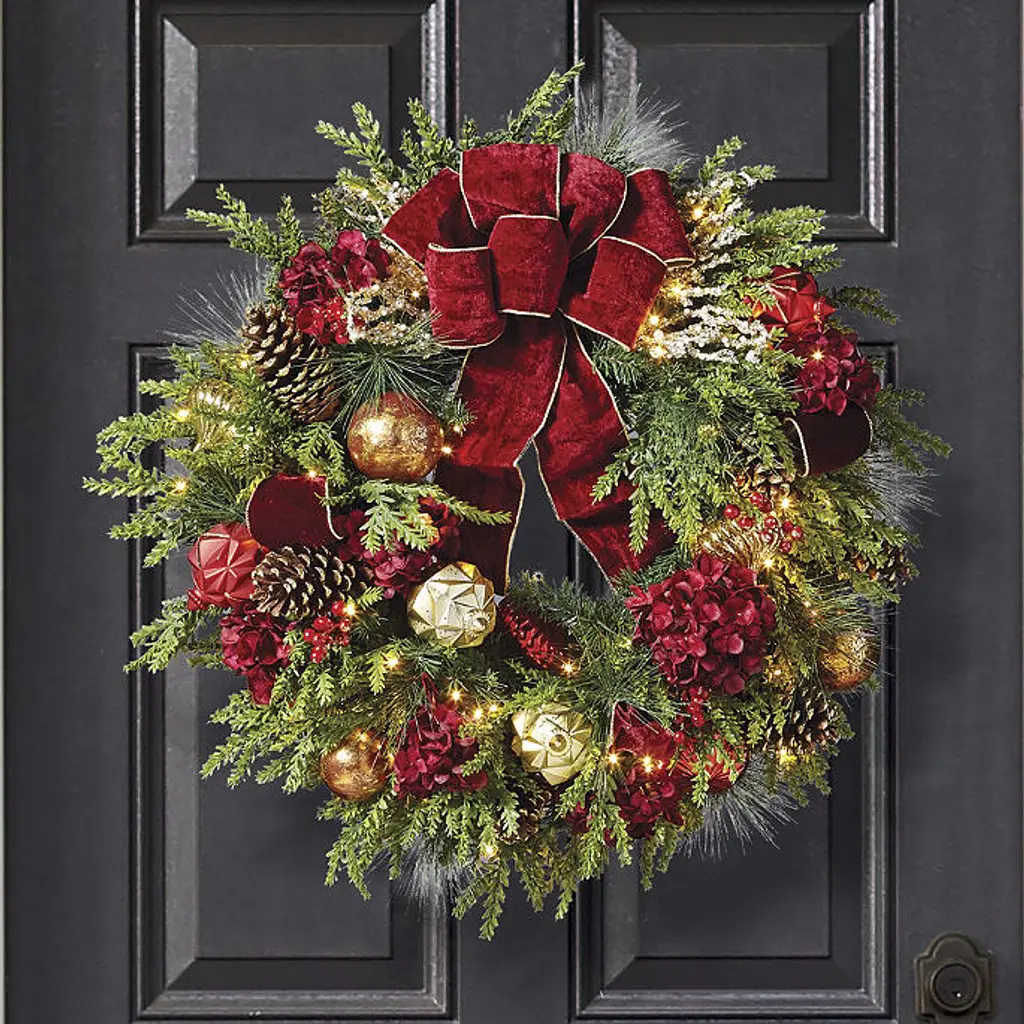 In a beautiful balance of regal splendor and natural beauty, lifelike greenery is exquisitely embellished in burgundy and gold. The Regal Splendor Greenery Collection is richly appointed with textured ornaments, jeweled picks, gilded pine cones and faux hydrangeas and berries. From the gold-trimmed velvet ribbon to the warm-white, short-tip LED lights, every element is carefully arranged by hand for a full, dramatic look. For covered outdoor or indoor use Lifelike cypress and pine, polyester velvet ribbon and hydrangeas, berries and natural pine cones Shatterproof ornaments Warm-white, short-tip LED lightsWreath has 100 lights, 140 tips6 ft. Garland has 120 lights, 150 tipsSwag has 60 lights, 150 tips Built-in timer option automatically turns the lights on for eight hours and off for 16 hours Fluff and shape greenery after unpacking To maximize the life of your greenery, we recommend a limit of 3 months of outdoor exposure per year Requires three "D" batteries (not included) Imported A Frontgate exclusive. At Frontgate, our primary focus is quality. We guarantee that every product we sell will stand up to the supreme test – our customers' satisfaction. To learn more about our policies, visit our Shipping & Processing, Returns & Exchanges and Warranty & Price Guarantee pages.