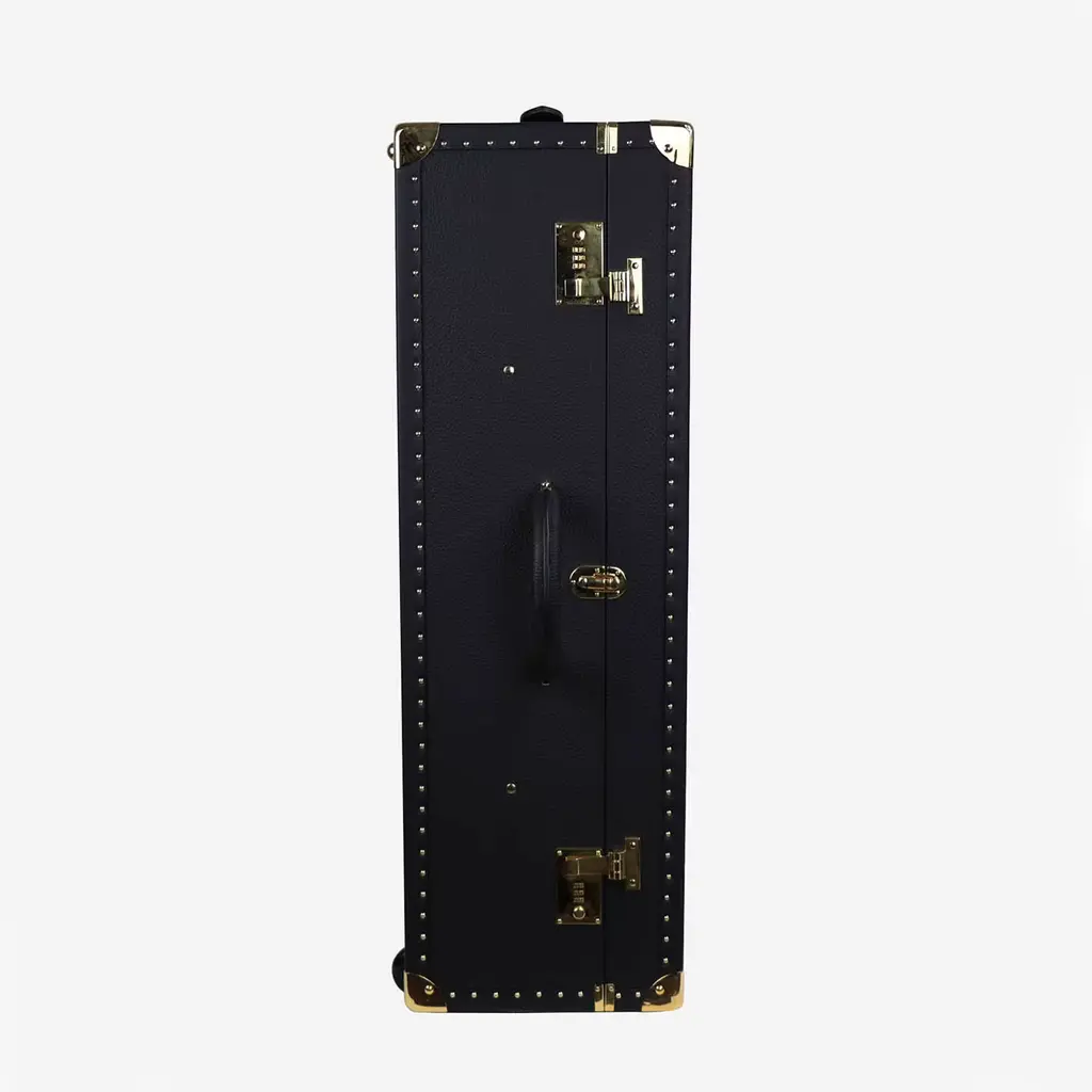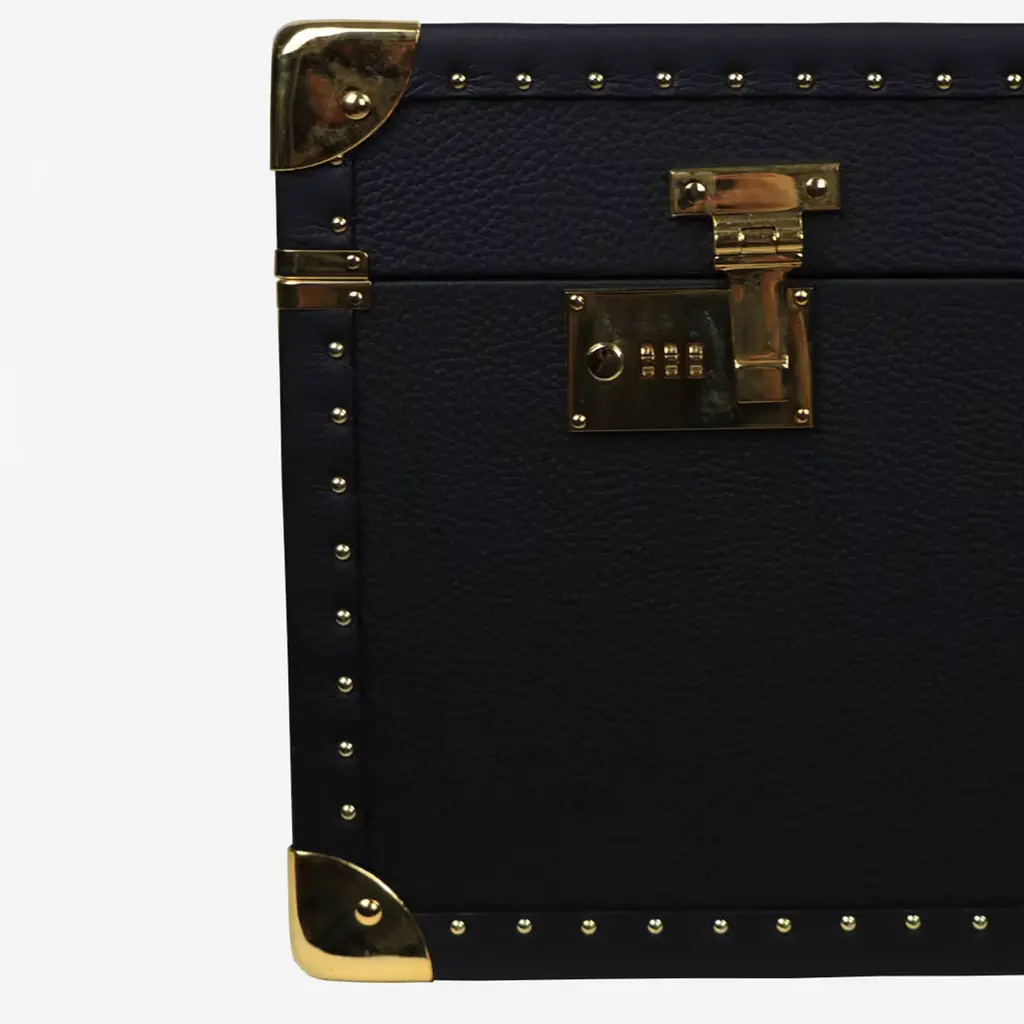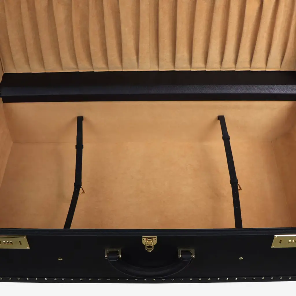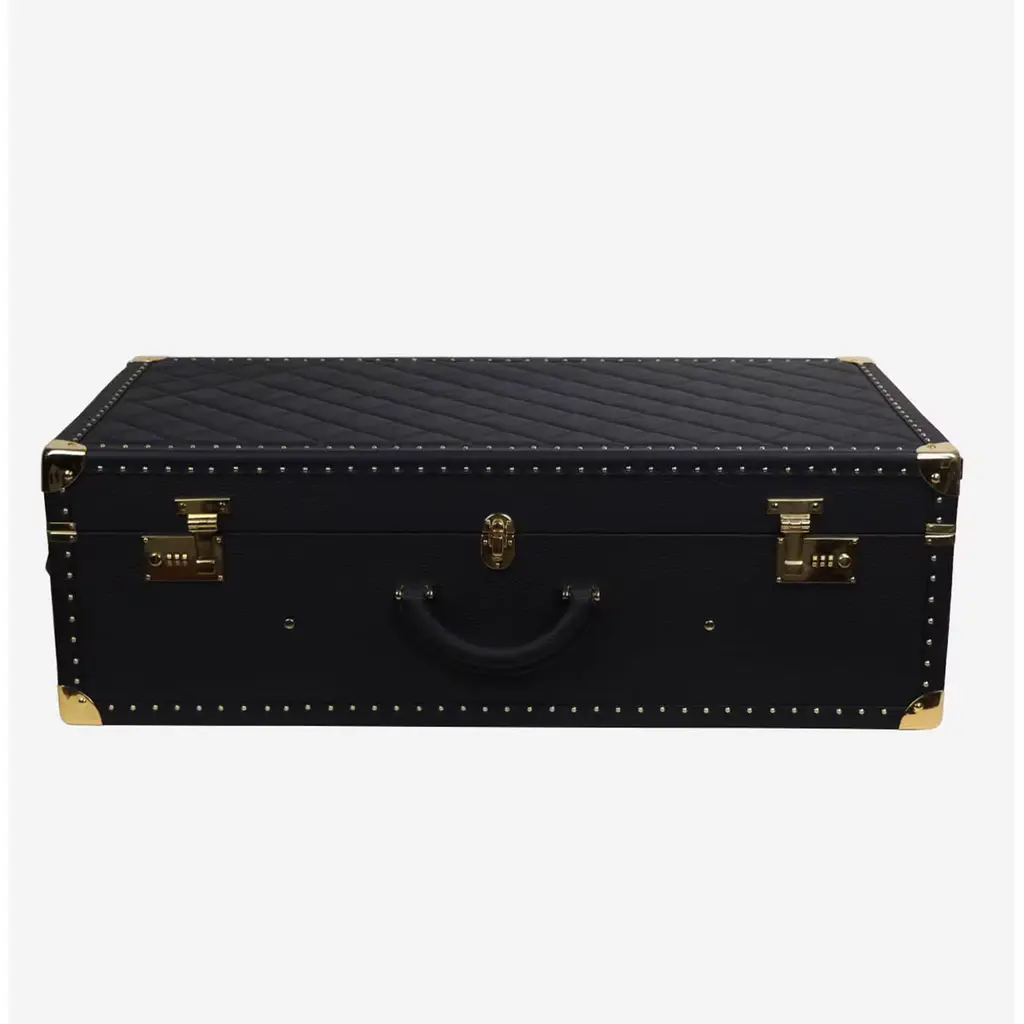Classic opulence and cutting-edge performance meet in this precious artisan suitcase of traditional inspiration. Featuring tiny wheels and inner belts for optimized practicality, it is also equipped with two handles and a combination lock attesting to its classic personality. Corner caps and studs finished in gold further embellish its prized quilted cover in genuine black leather. Wide enough to host jewel essentials.